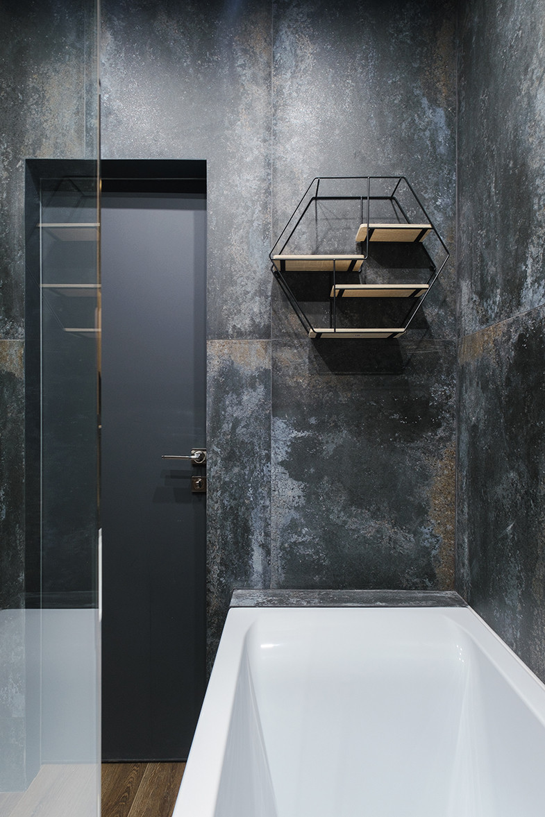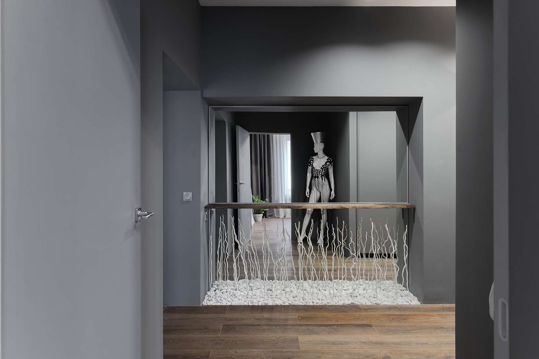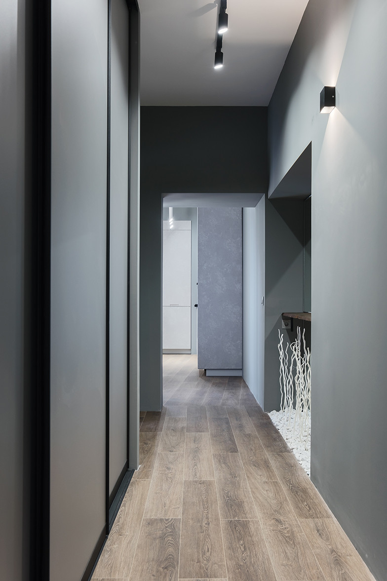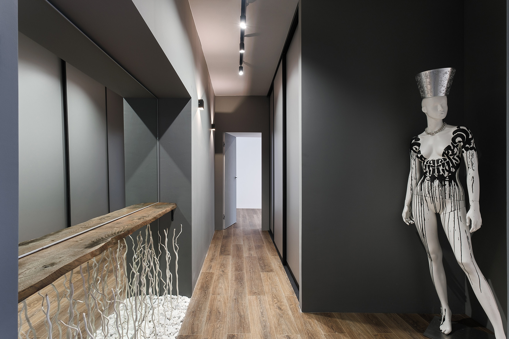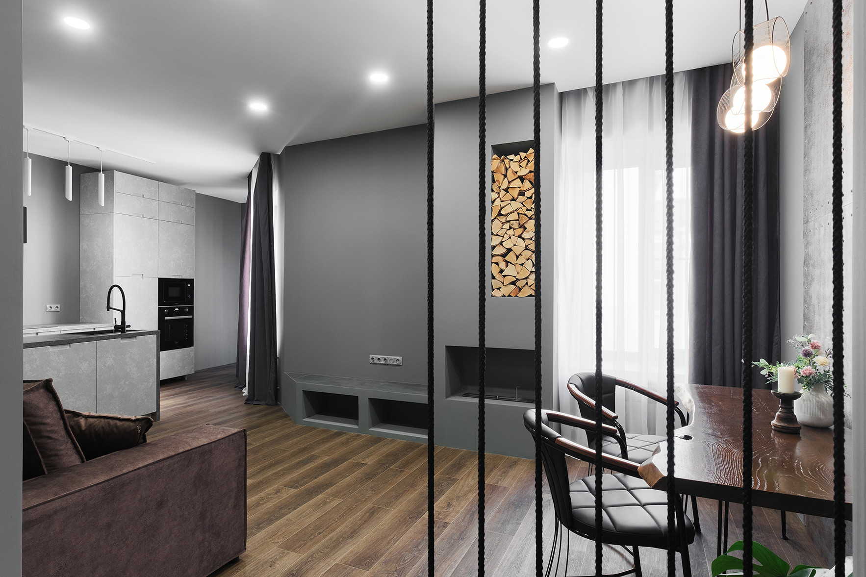 Отличительными чертами объекта являются высокие потолки 2,9 м, установленный в гостиной комнате камин на биотопливе, дизайнерские предметы интерьера. Общий современный стиль квартиры дополняет лофт-перегородка с затемнённым стеклом. Преимущественная цветовая гамма квартиры – темная и приглушенная, однако детская выполнена в светлых тонах.
