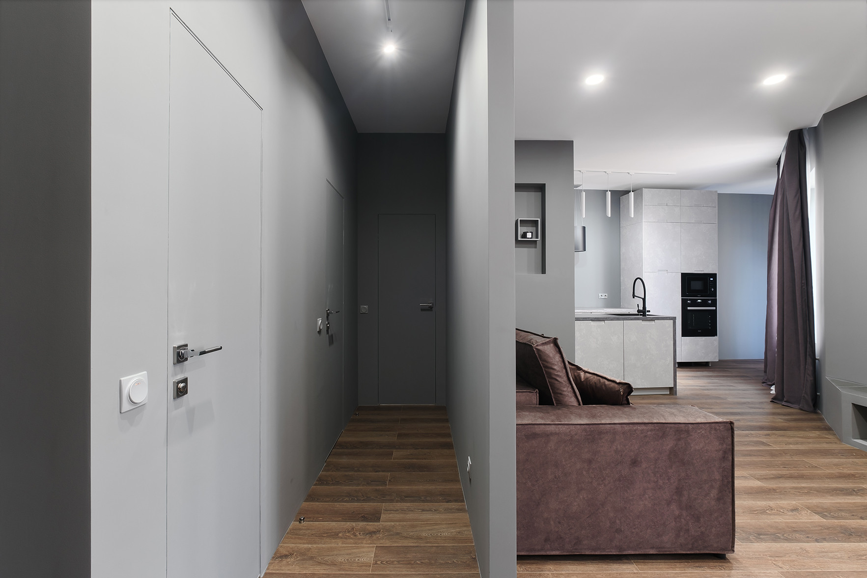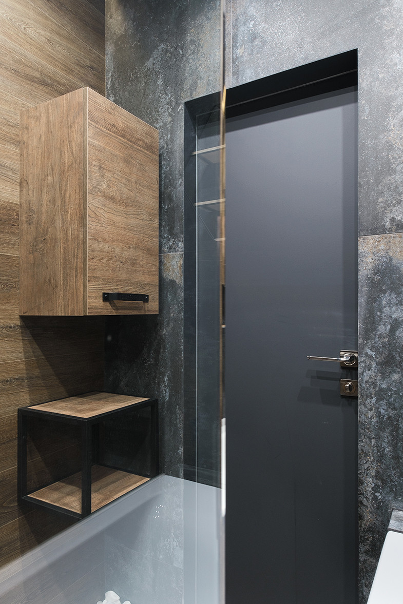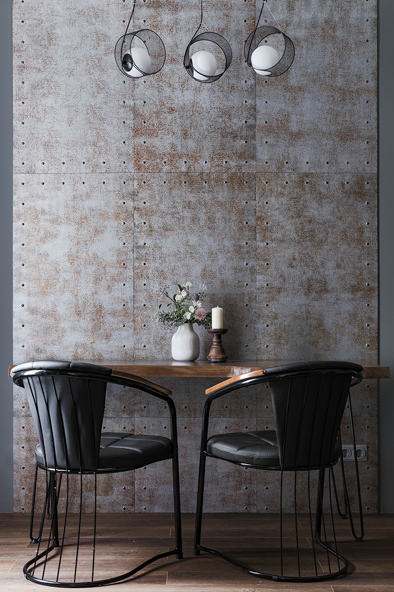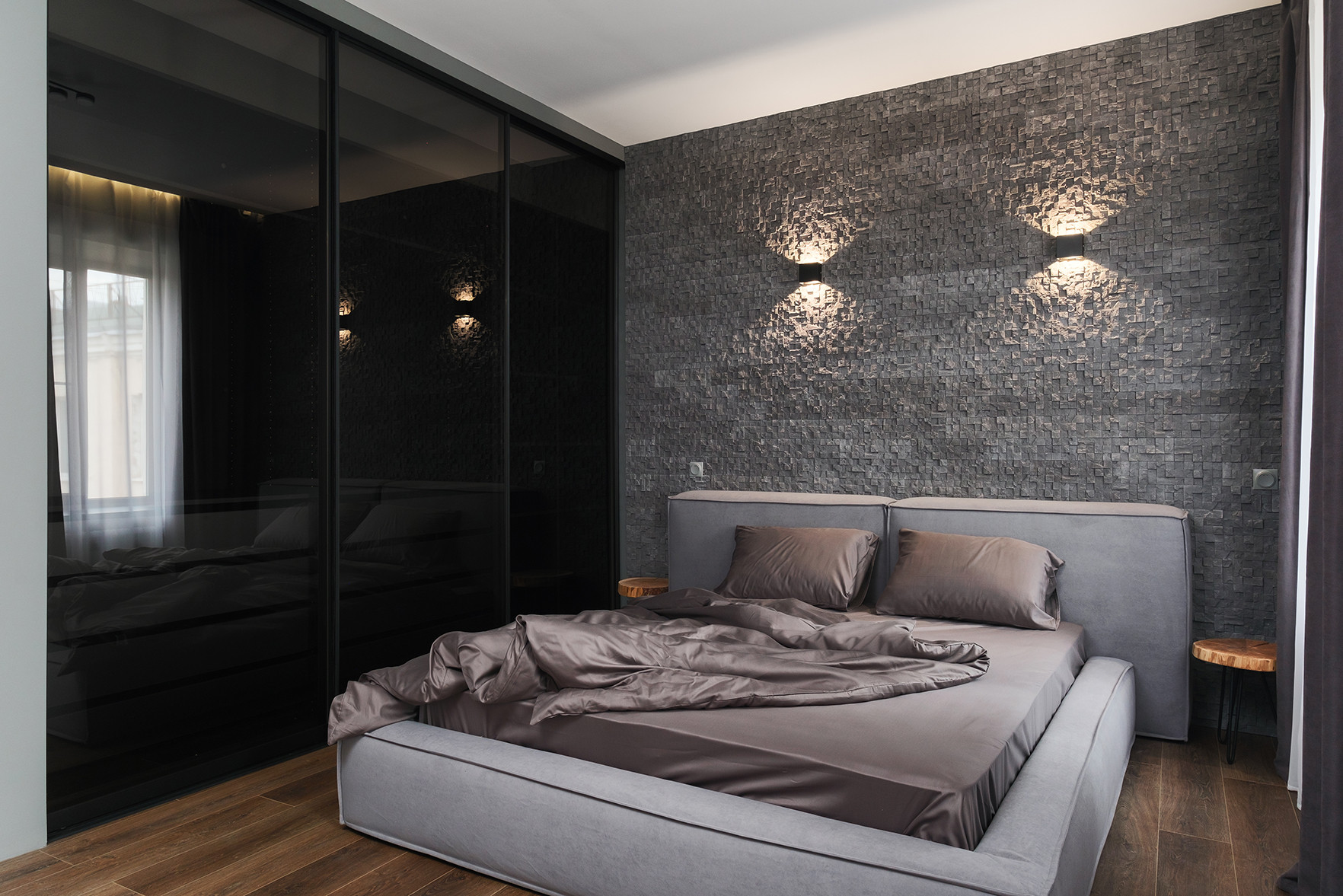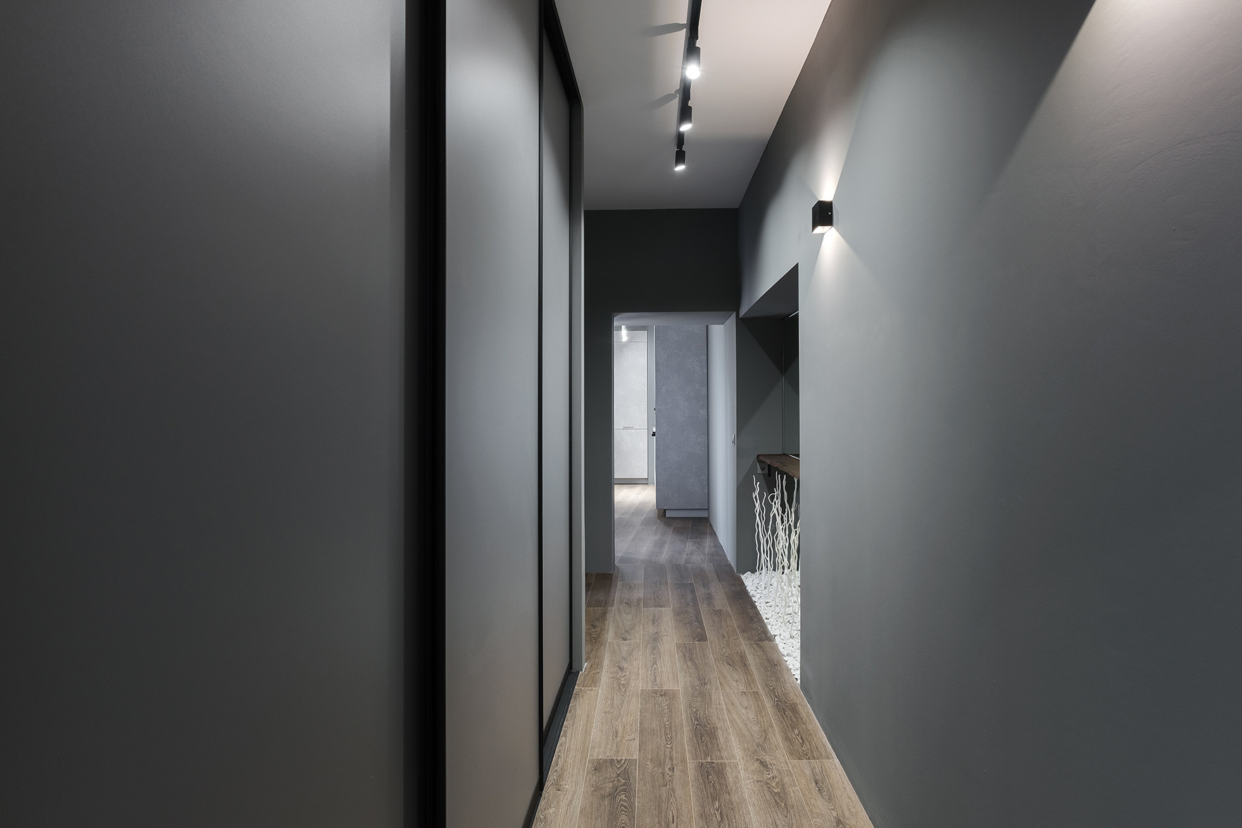 Отличительными чертами объекта являются высокие потолки 2,9 м, установленный в гостиной комнате камин на биотопливе, дизайнерские предметы интерьера. Общий современный стиль квартиры дополняет лофт-перегородка с затемнённым стеклом. Преимущественная цветовая гамма квартиры – темная и приглушенная, однако детская выполнена в светлых тонах.