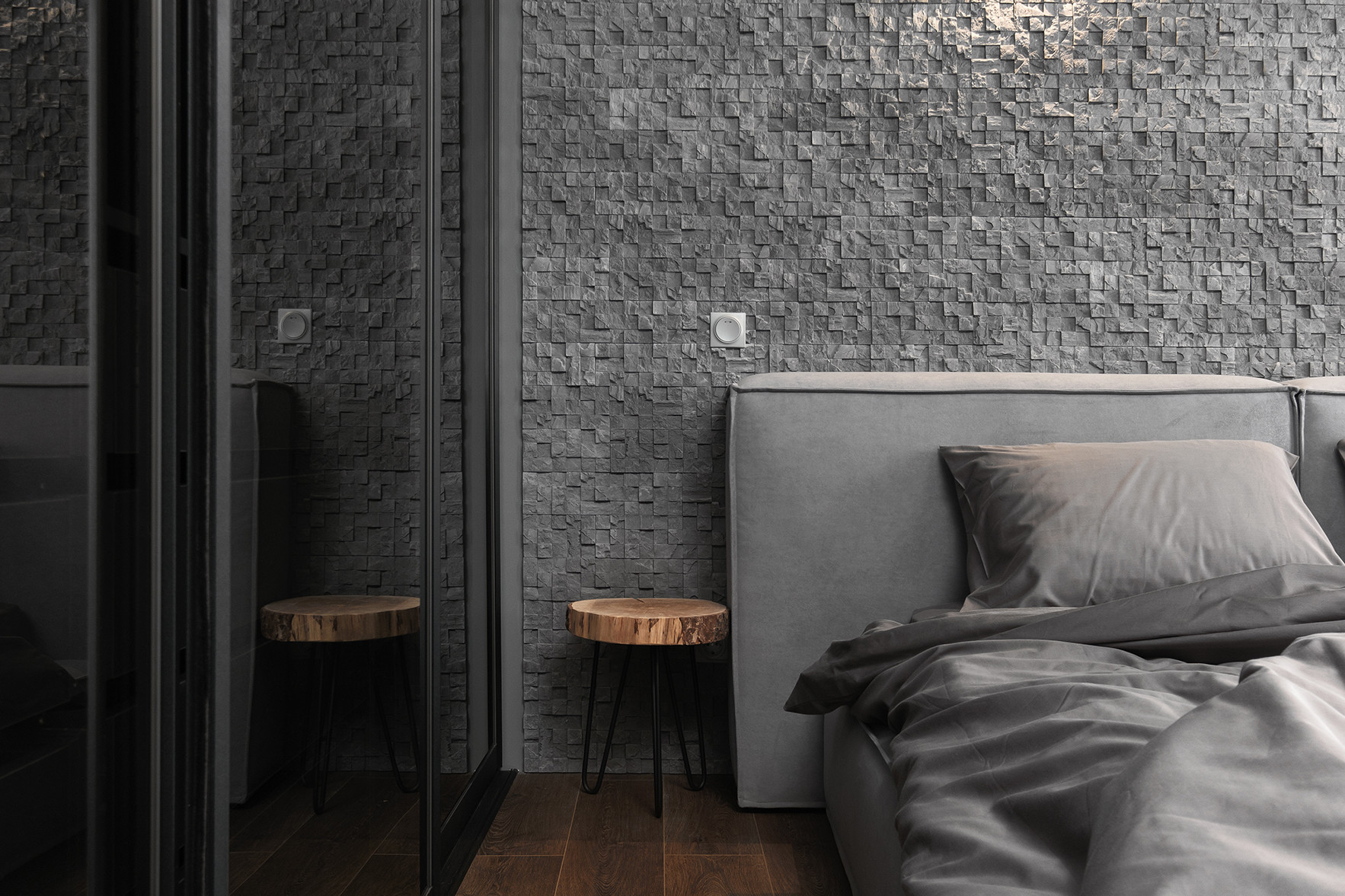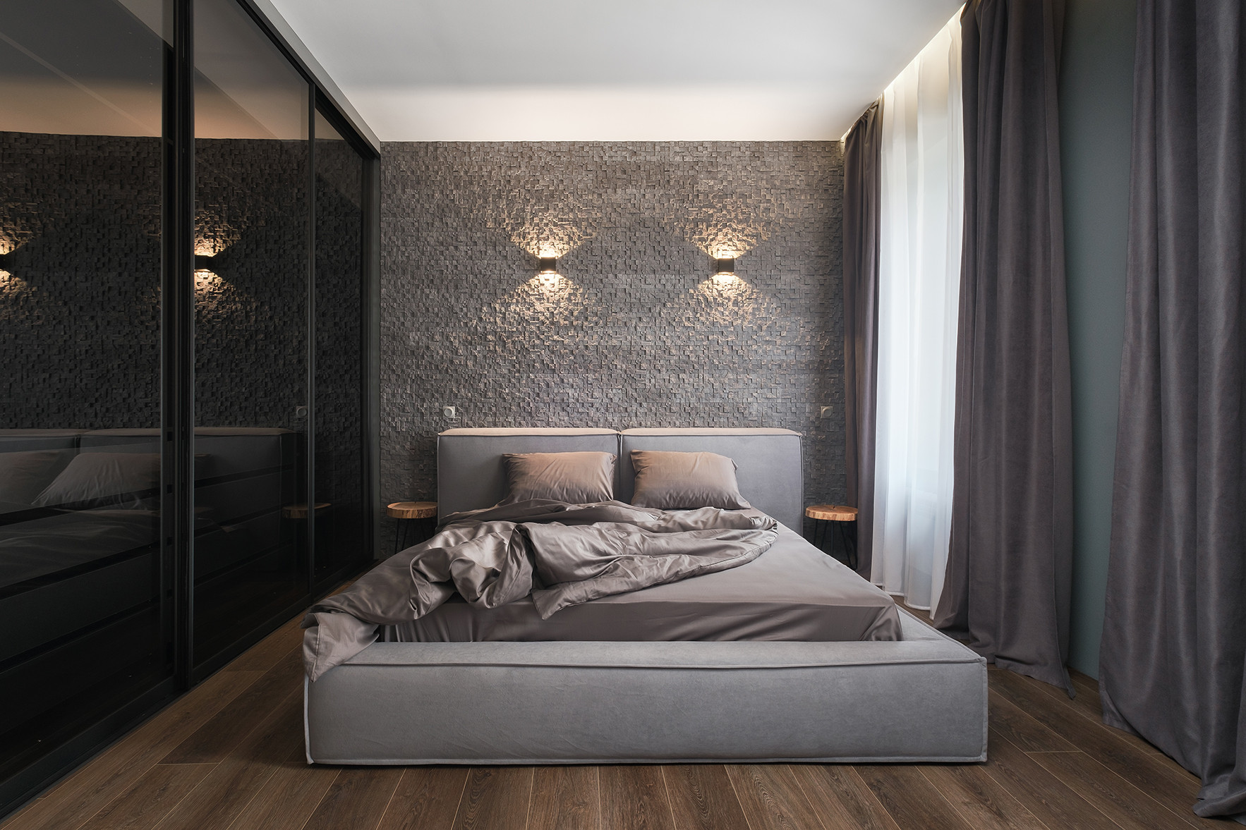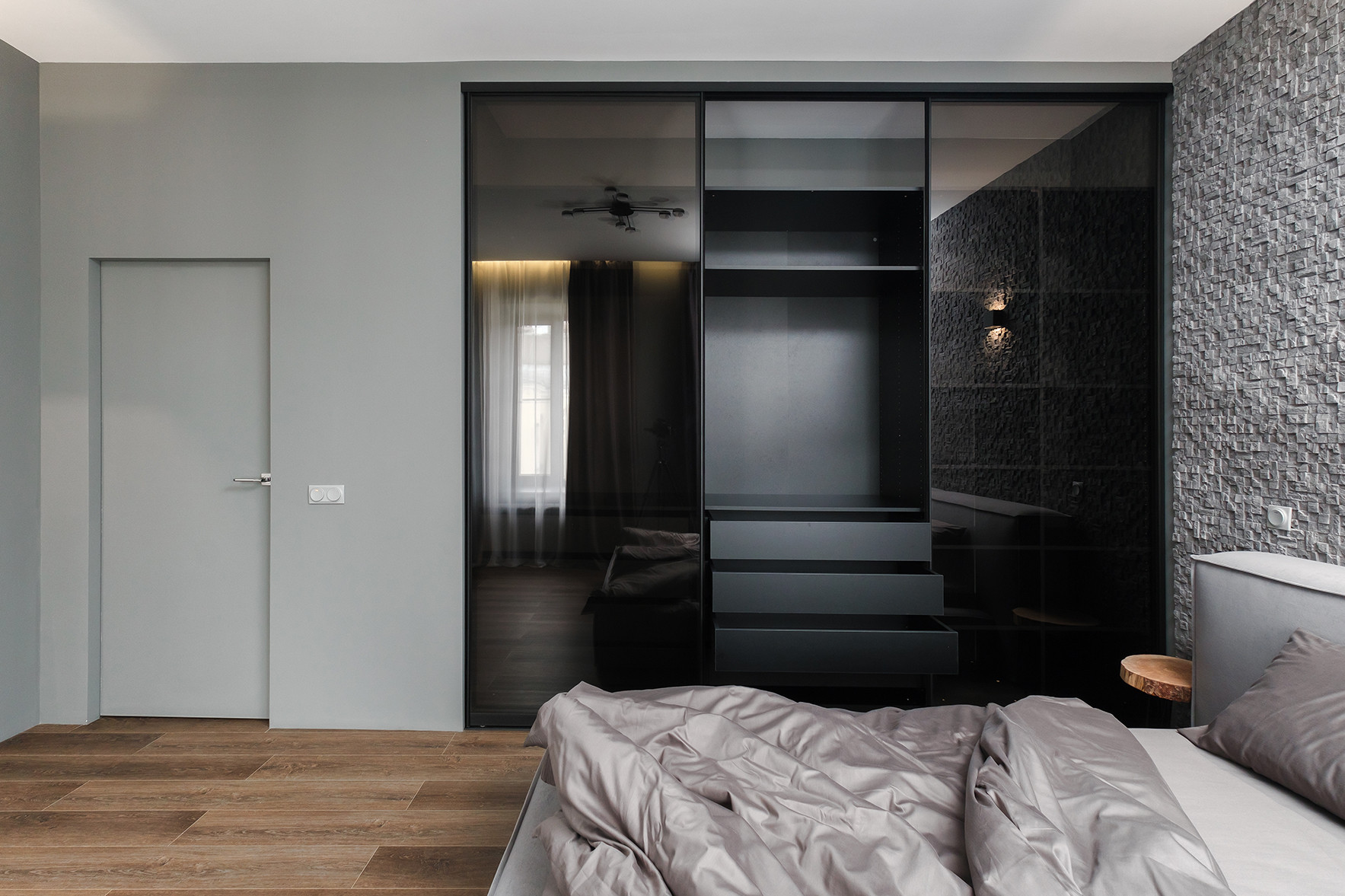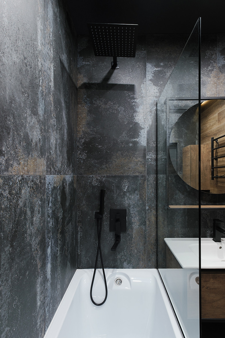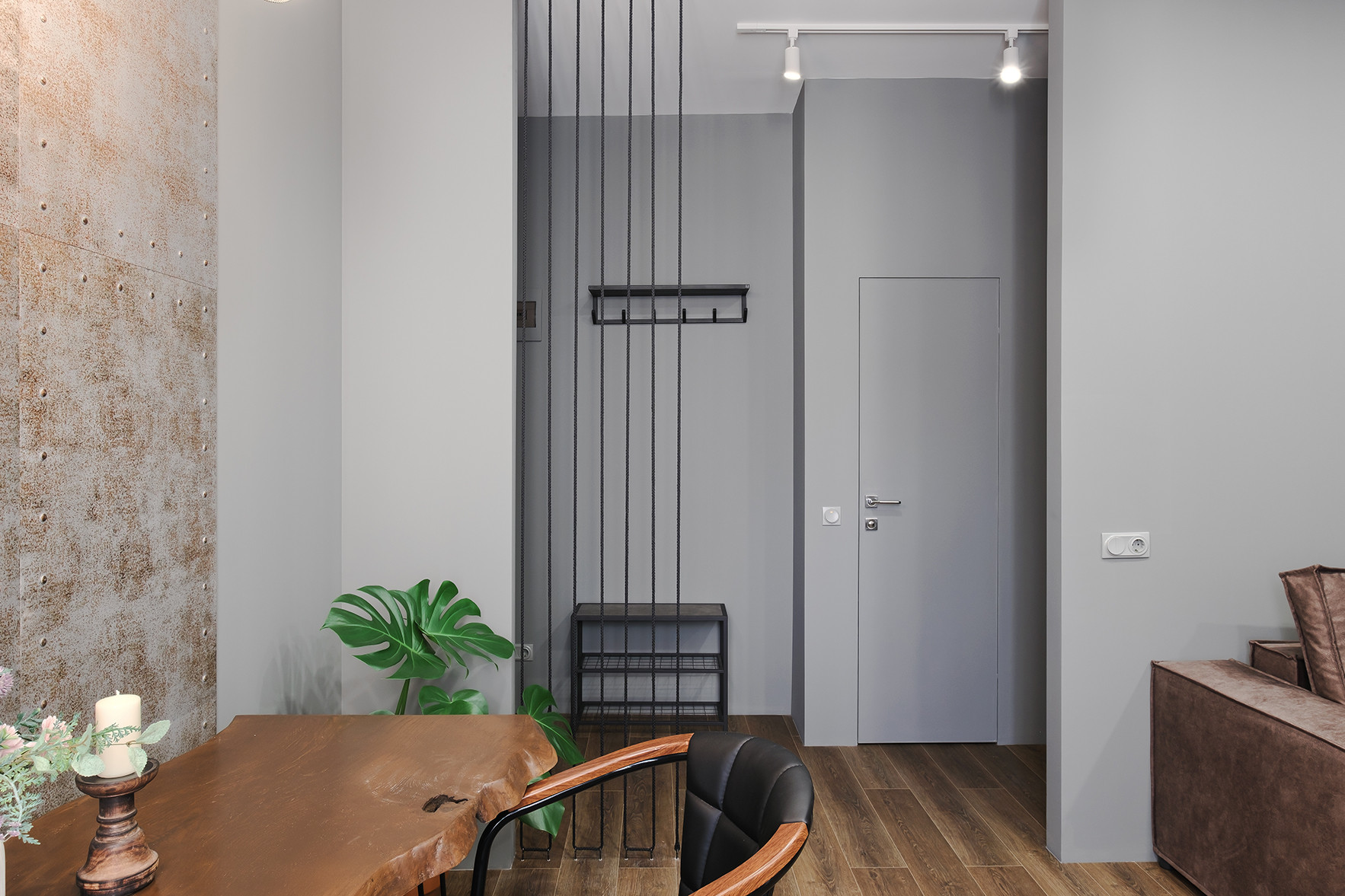 Отличительными чертами объекта являются высокие потолки 2,9 м, установленный в гостиной комнате камин на биотопливе, дизайнерские предметы интерьера. Общий современный стиль квартиры дополняет лофт-перегородка с затемнённым стеклом. Преимущественная цветовая гамма квартиры – темная и приглушенная, однако детская выполнена в светлых тонах.