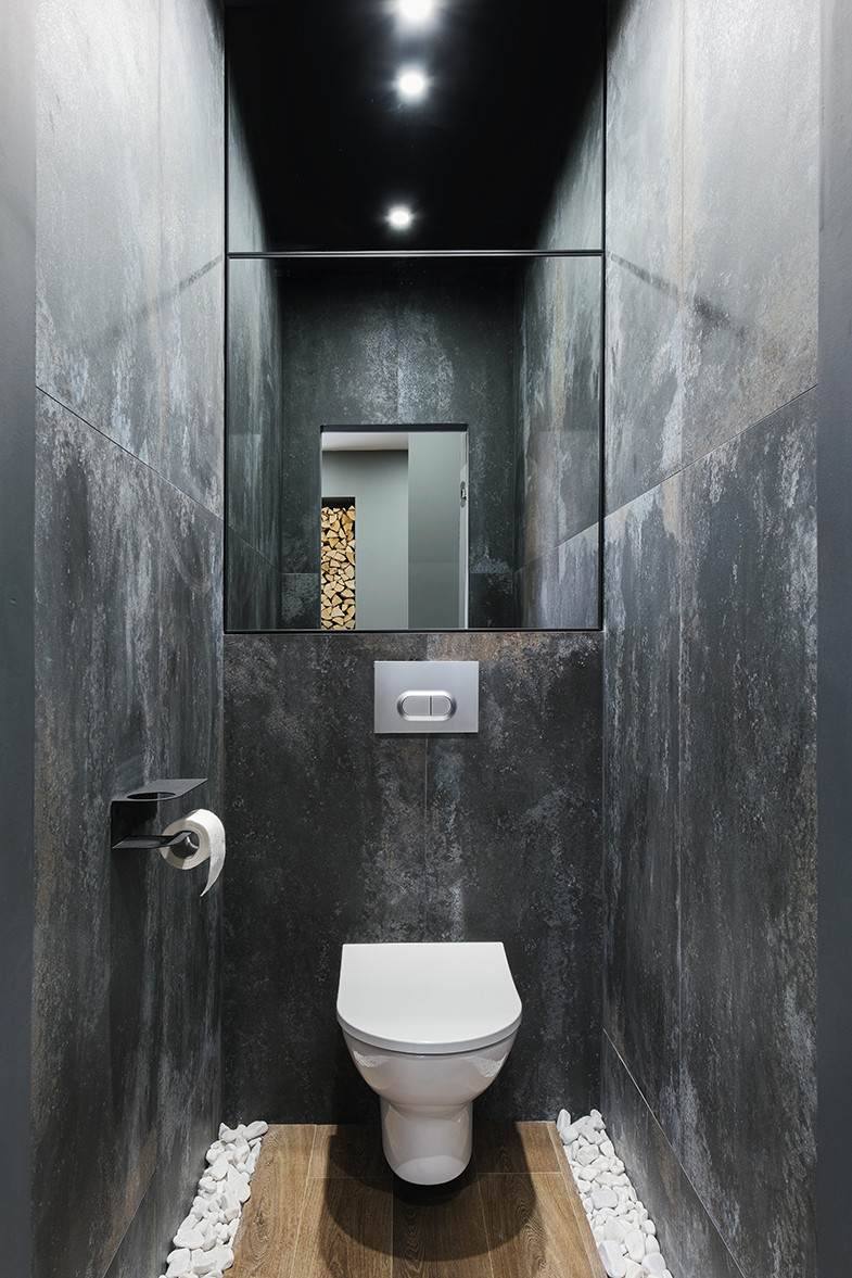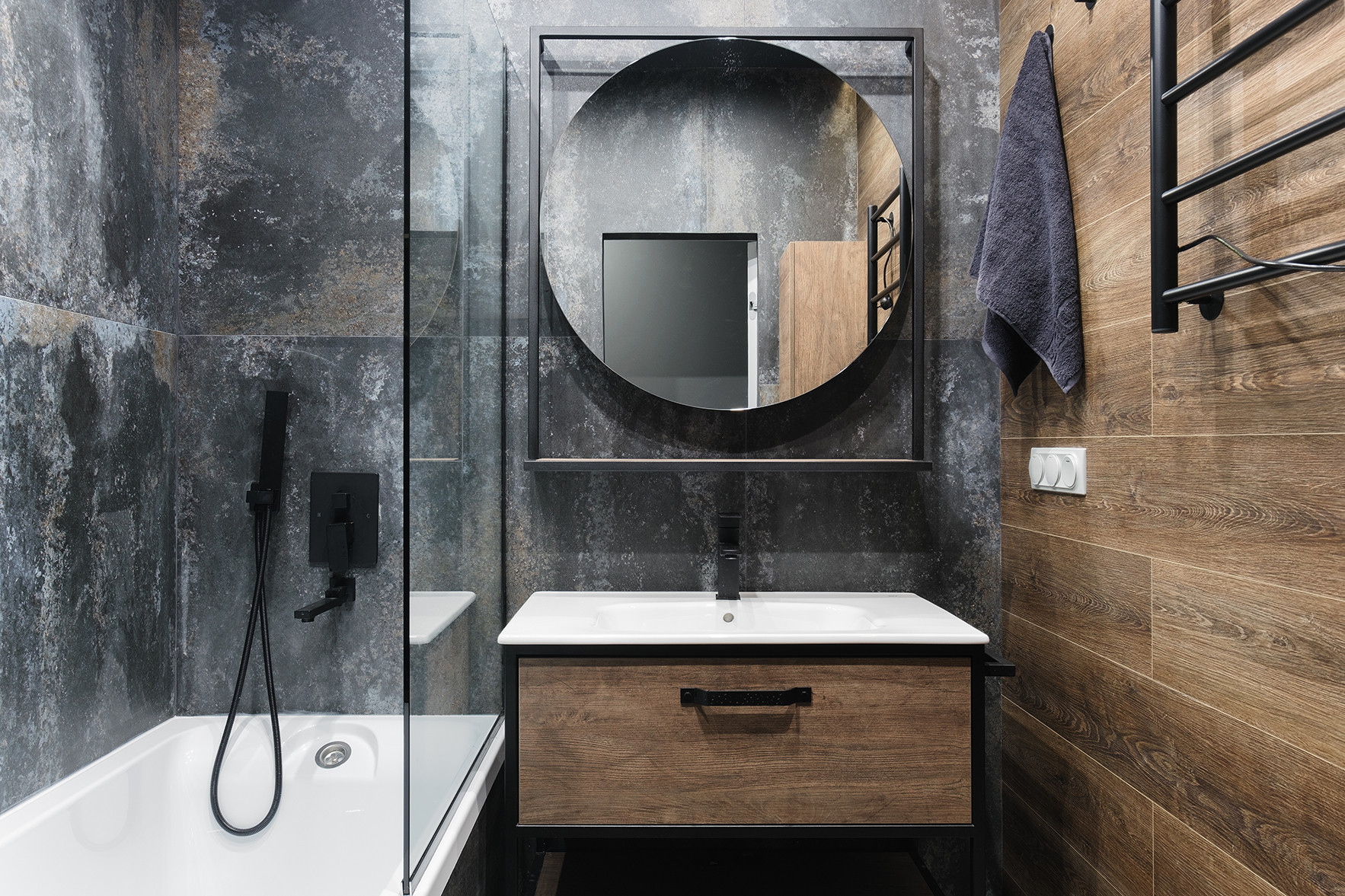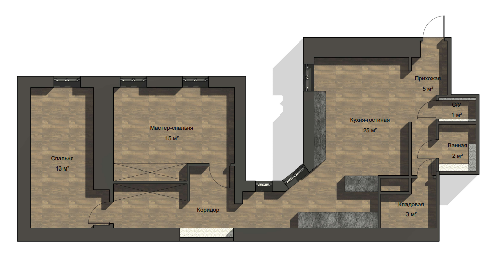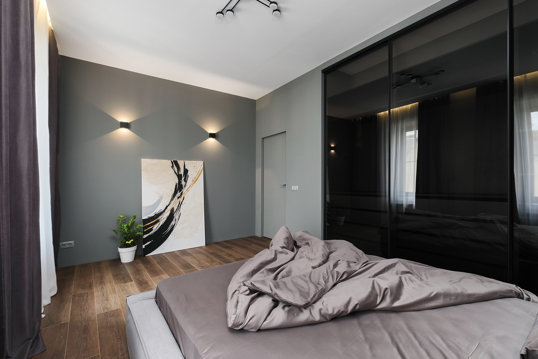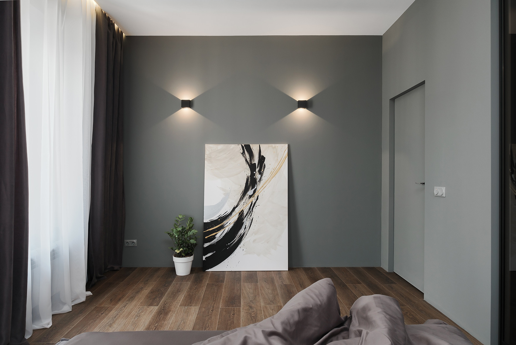 Отличительными чертами объекта являются высокие потолки 2,9 м, установленный в гостиной комнате камин на биотопливе, дизайнерские предметы интерьера. Общий современный стиль квартиры дополняет лофт-перегородка с затемнённым стеклом. Преимущественная цветовая гамма квартиры – темная и приглушенная, однако детская выполнена в светлых тонах.
