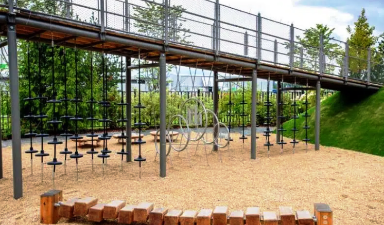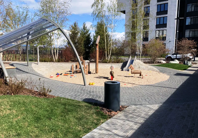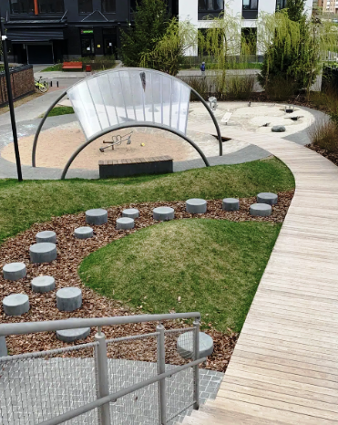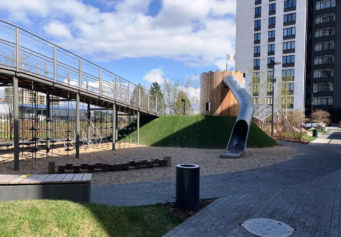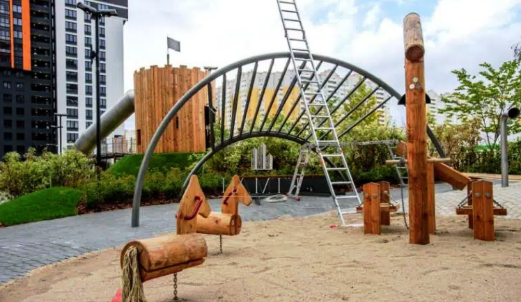 Три детских площадки от Richter Spielgerte - особая фишка проекта. Оборудование способствует развитию ребенка, знакомит его с законами физики и развивает ловкость ребенка.