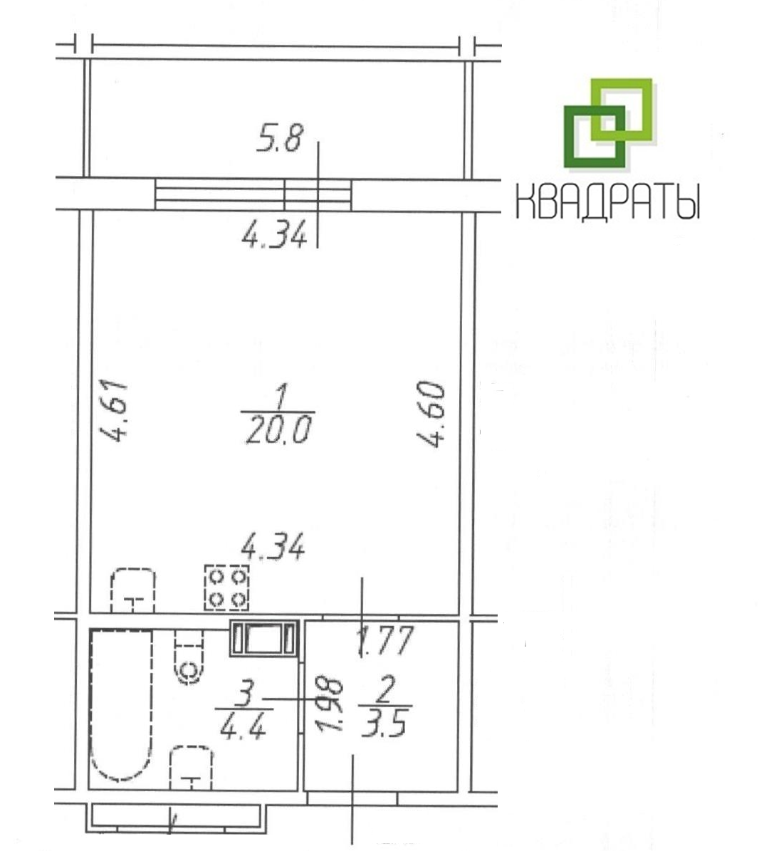 Комната 20 м.кв., с/у 4.4 м.кв., холл 3.5м.кв.,