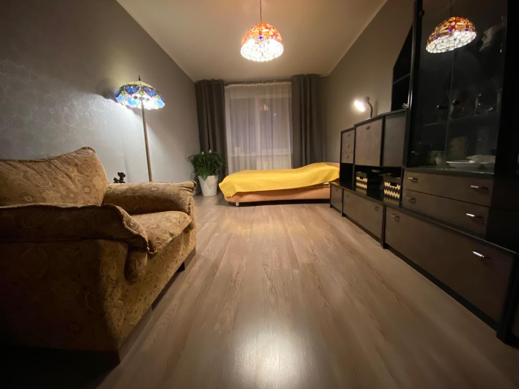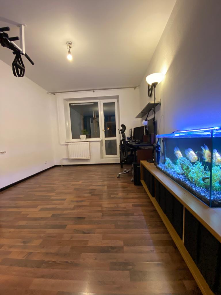 Отдельная ванная комната 2,7 м2 с возможность установки стиральной машинки, бойлер и санузел 1.0 м2. Качественный ламинат в комнатах, плитка на кухне, ванной комнате и туалете. Окна пластиковые, стены и полы выровнены, радиаторы новые. Все в рабочем отличном состоянии. Вид из кухни и двух комнат на зеленый двор, из большой комнаты на пр-кт Пятилеток(дом в глубине от проспекта).