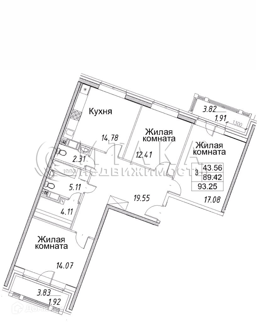 3-комнатная квартира, 93.25 м2, этаж 5 / 12, на продажу в Санкт-Петербурге, Плесецкая улица, 4