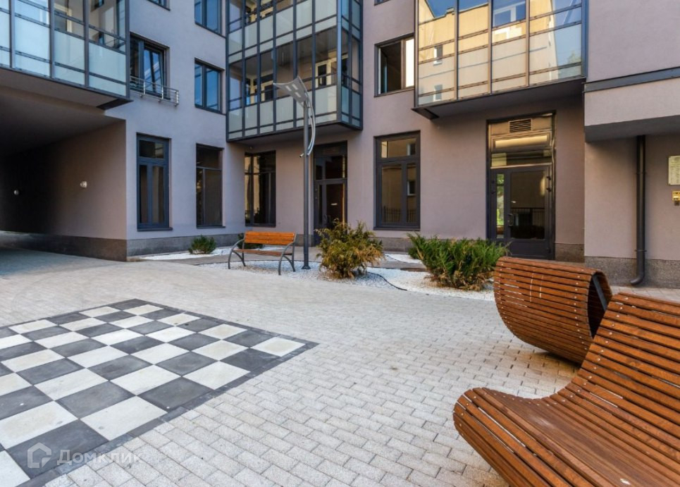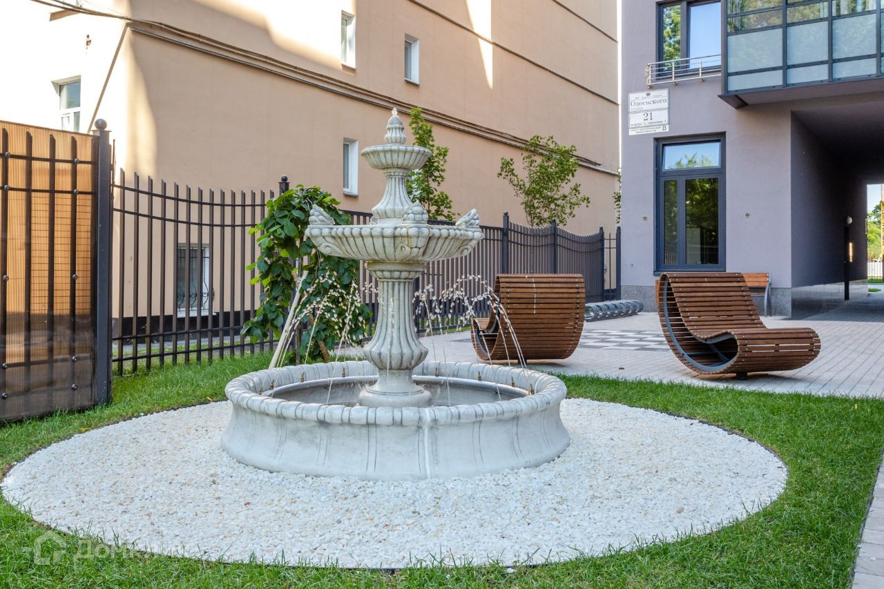 Во дворе комплекса уложена тротуарная плитка, разбиты газоны, высажены деревья, установлен фонтан и большая шахматная доска.
