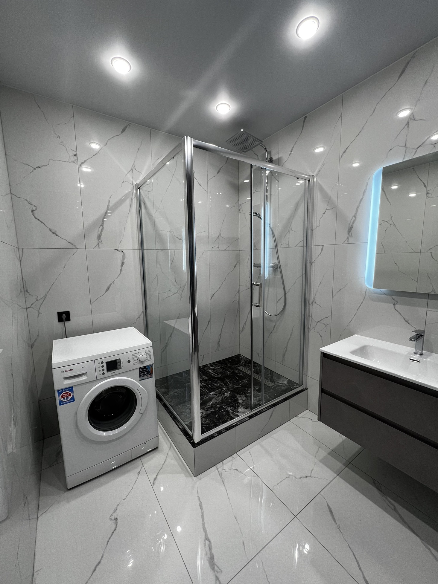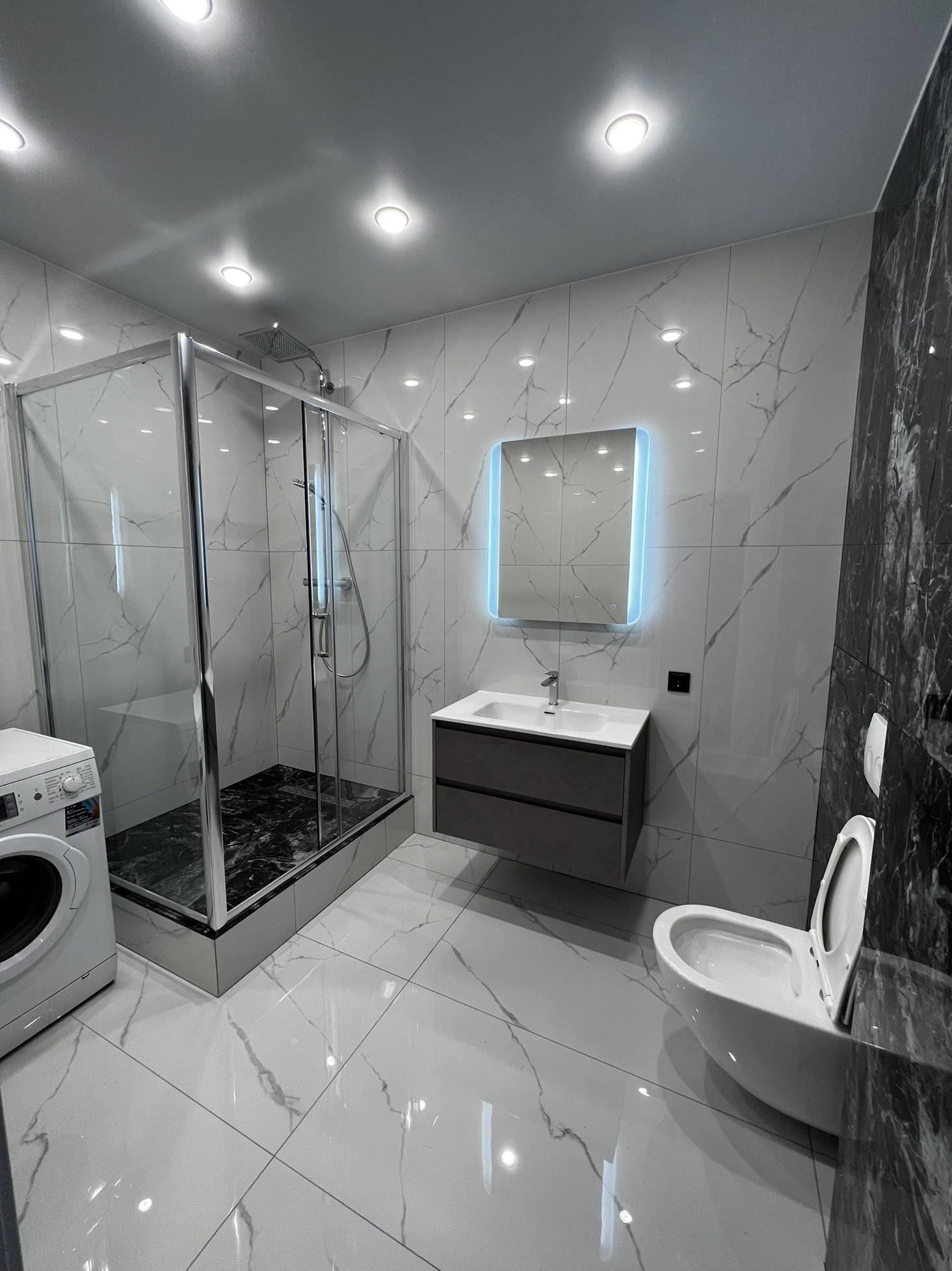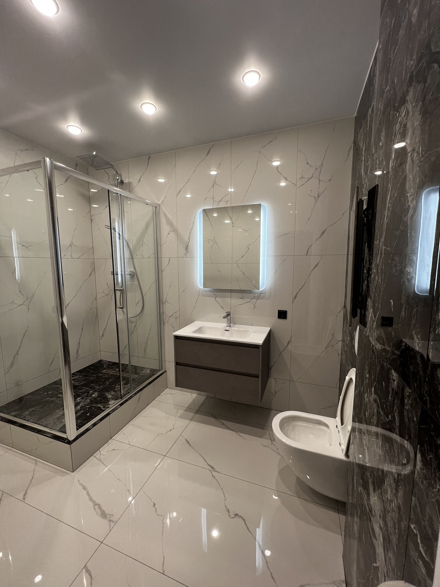 Выполнена правильная разводка электрики и сантехники:выключатели,розетки и диммеры верхней линейки фирмы JUNG, сантехника именитых фирм Jacob Delafon,TeCe, Geberit,Hansgrohe.
