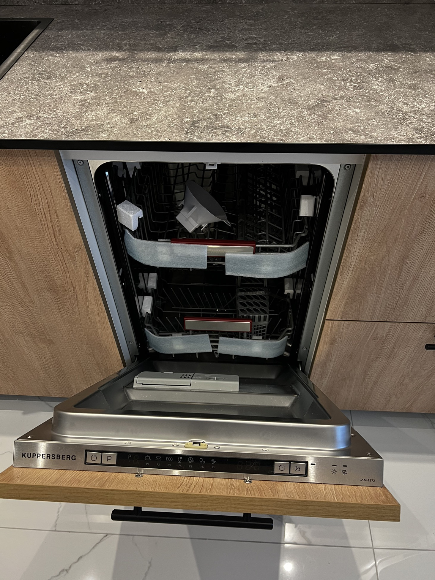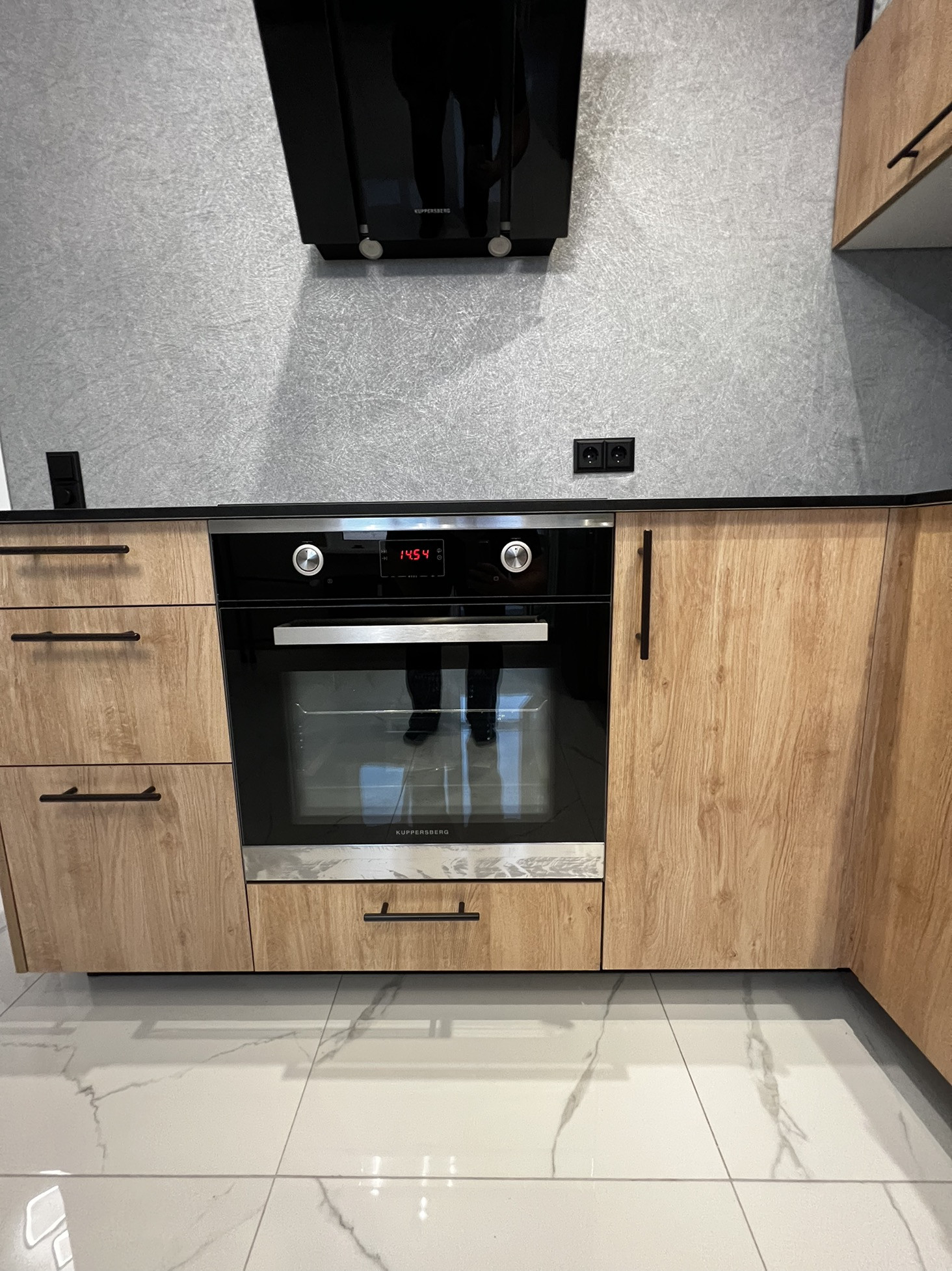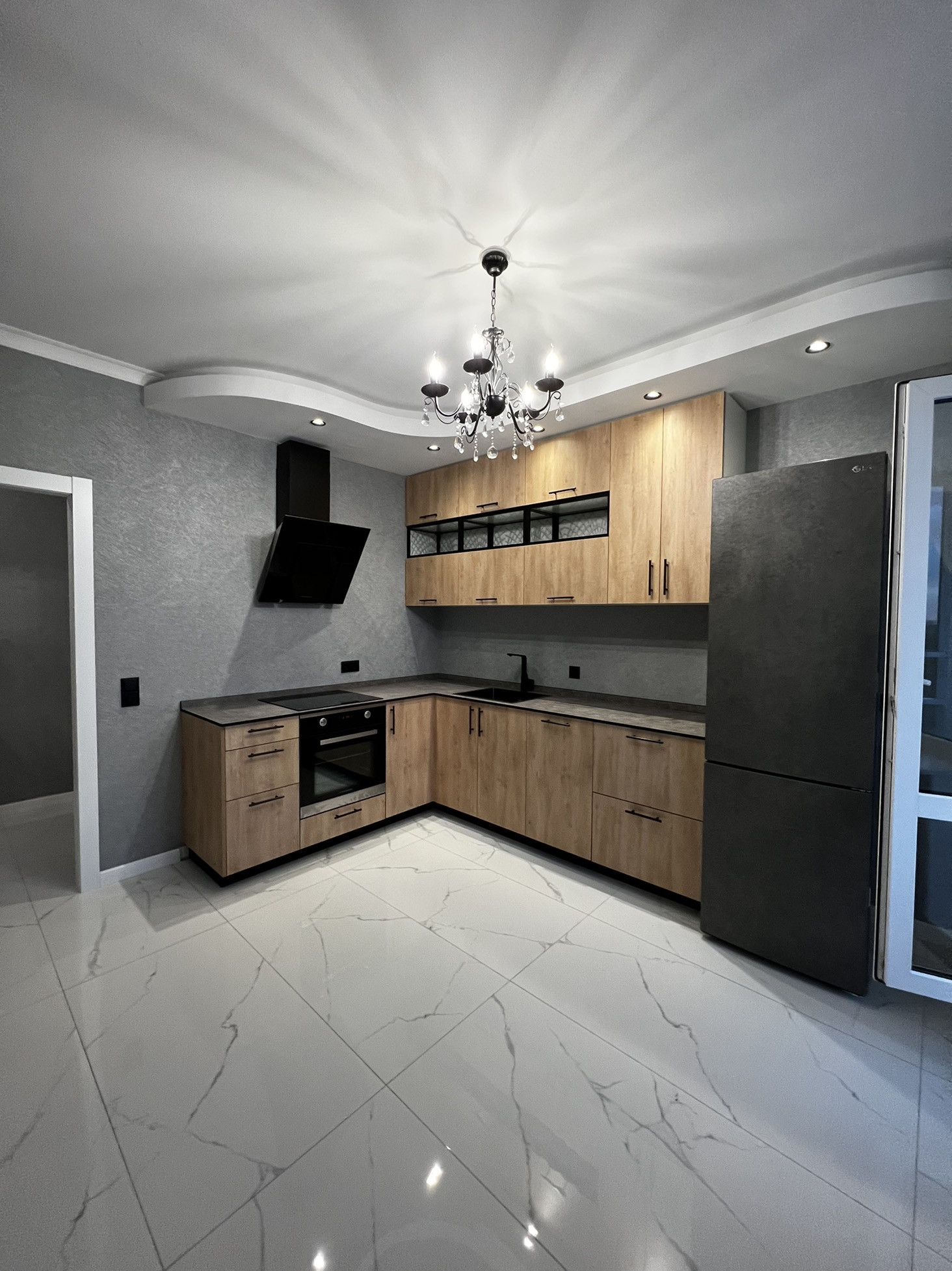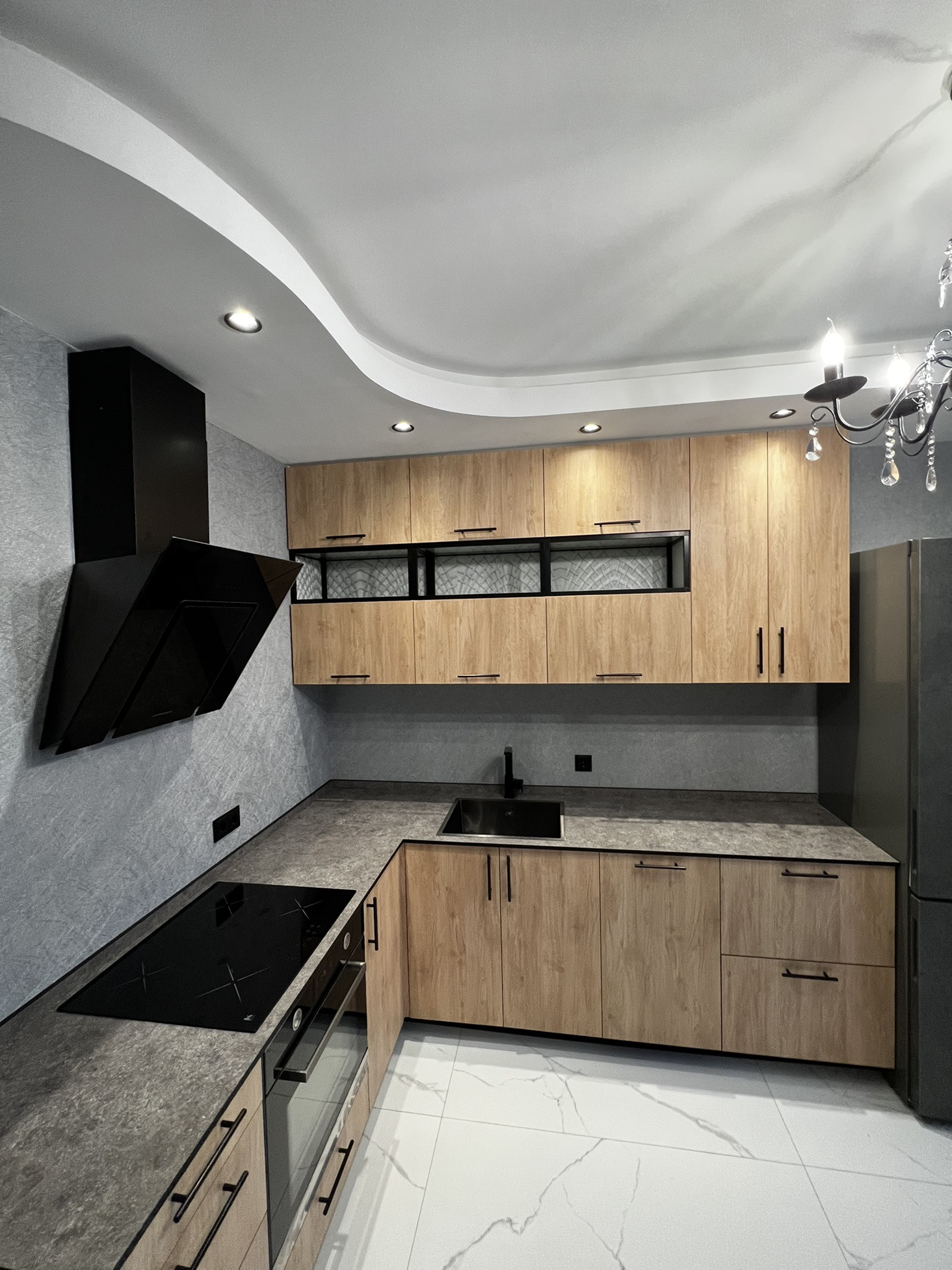 Дорогой кухонный гарнитур с каменной столешницей.