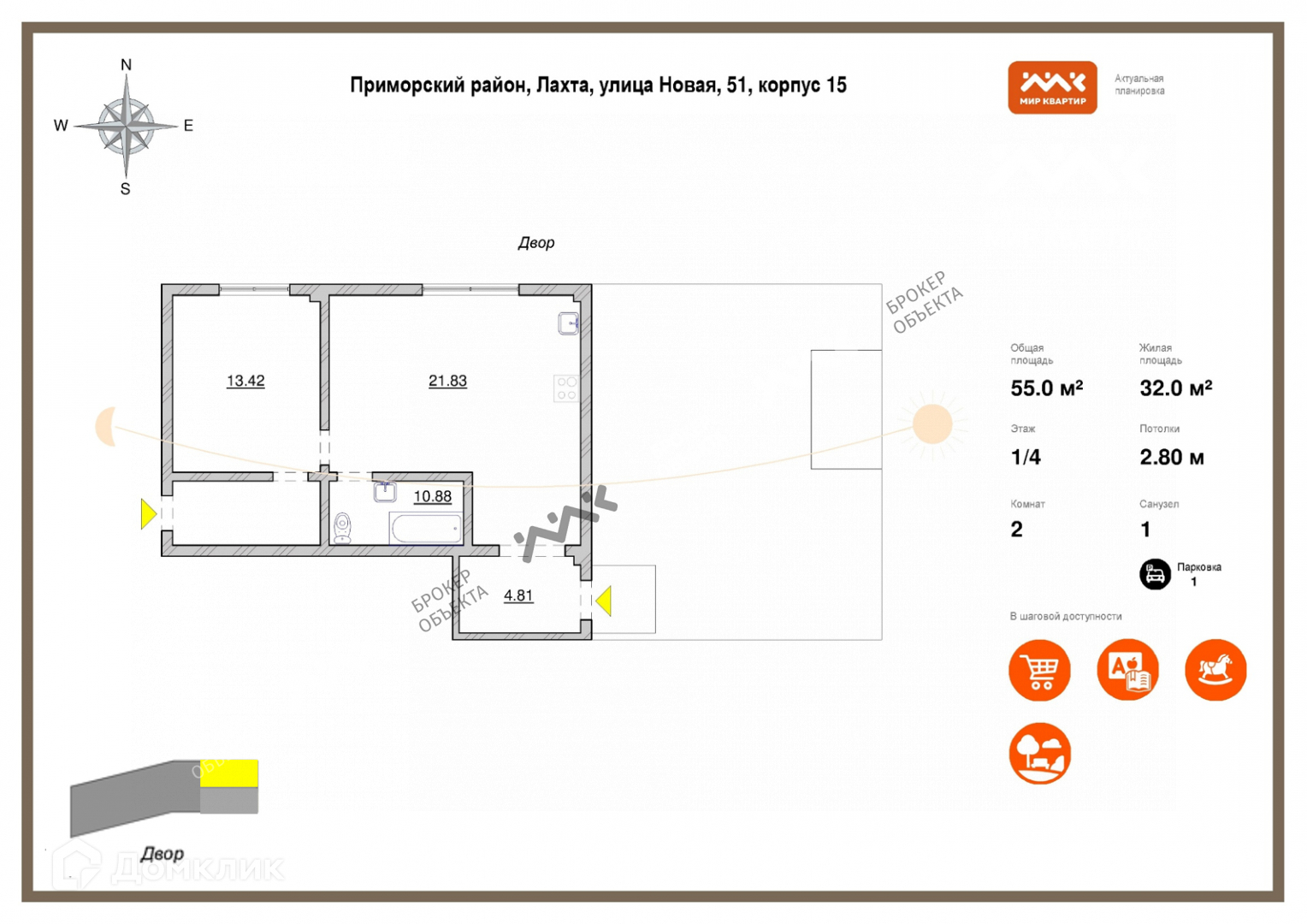 2-комнатная квартира, 55 м2, этаж 1 / 4, на продажу в Санкт-Петербурге, Новая улица, 51к15
