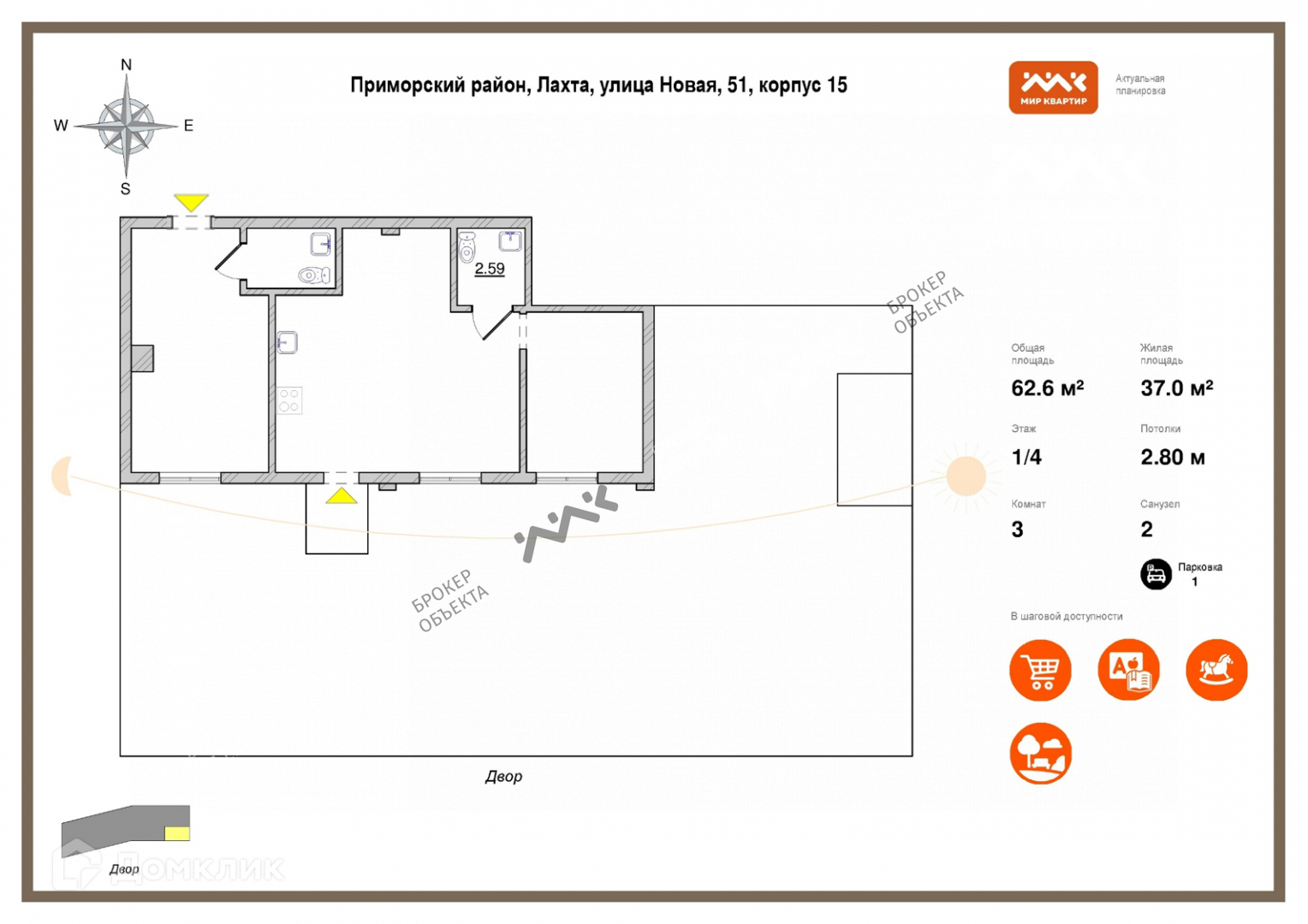 3-комнатная квартира, 62.6 м2, этаж 1 / 4, на продажу в Санкт-Петербурге, Новая улица, 51к15