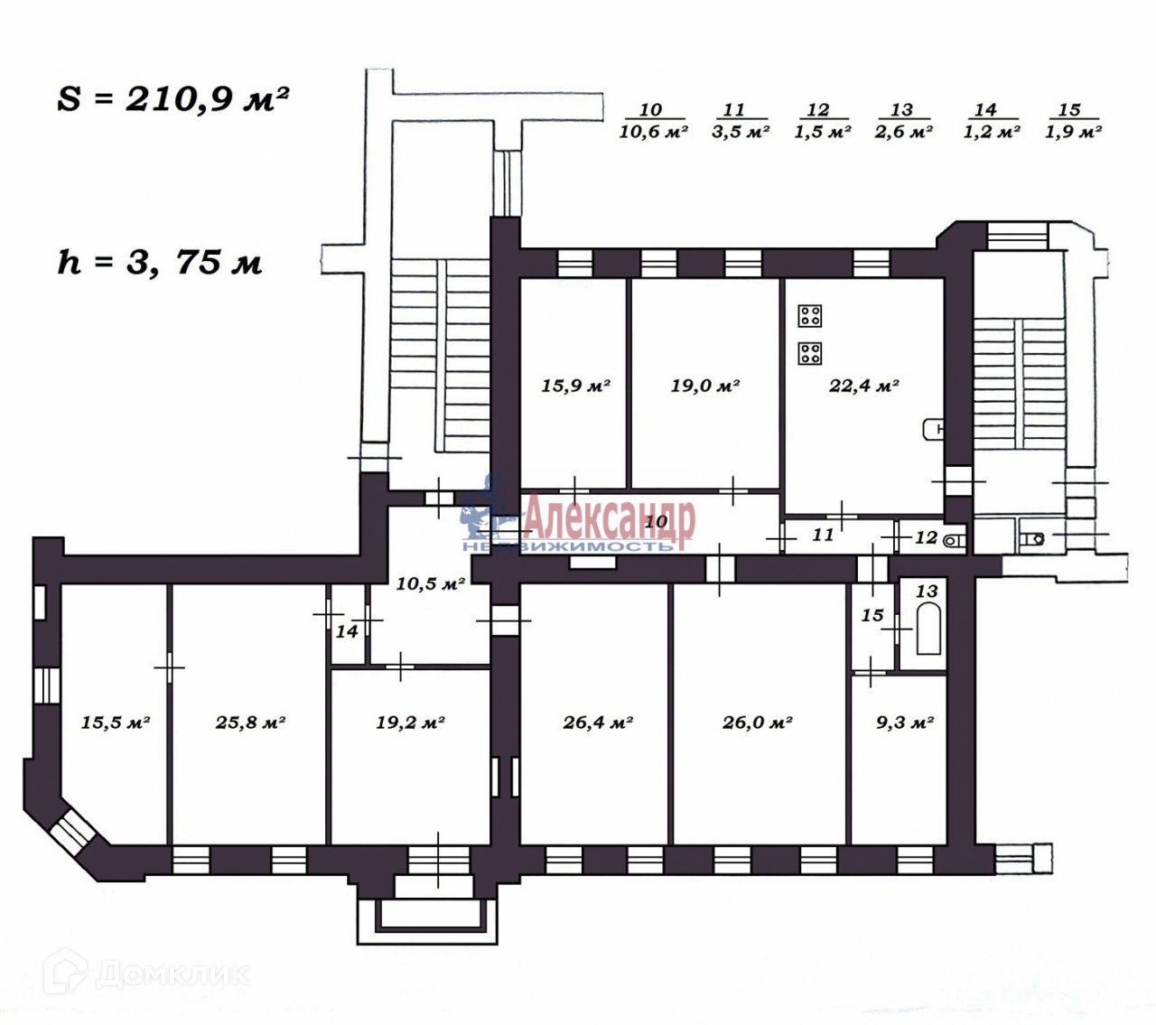 • Общая площадь: 210,9 м². Жилая: 157,1 м². Кухни: 22,4 м². Ванной комнаты: 2,6 м² (возможность расширить до 13,8 м²). Туалета: 1,5 м².