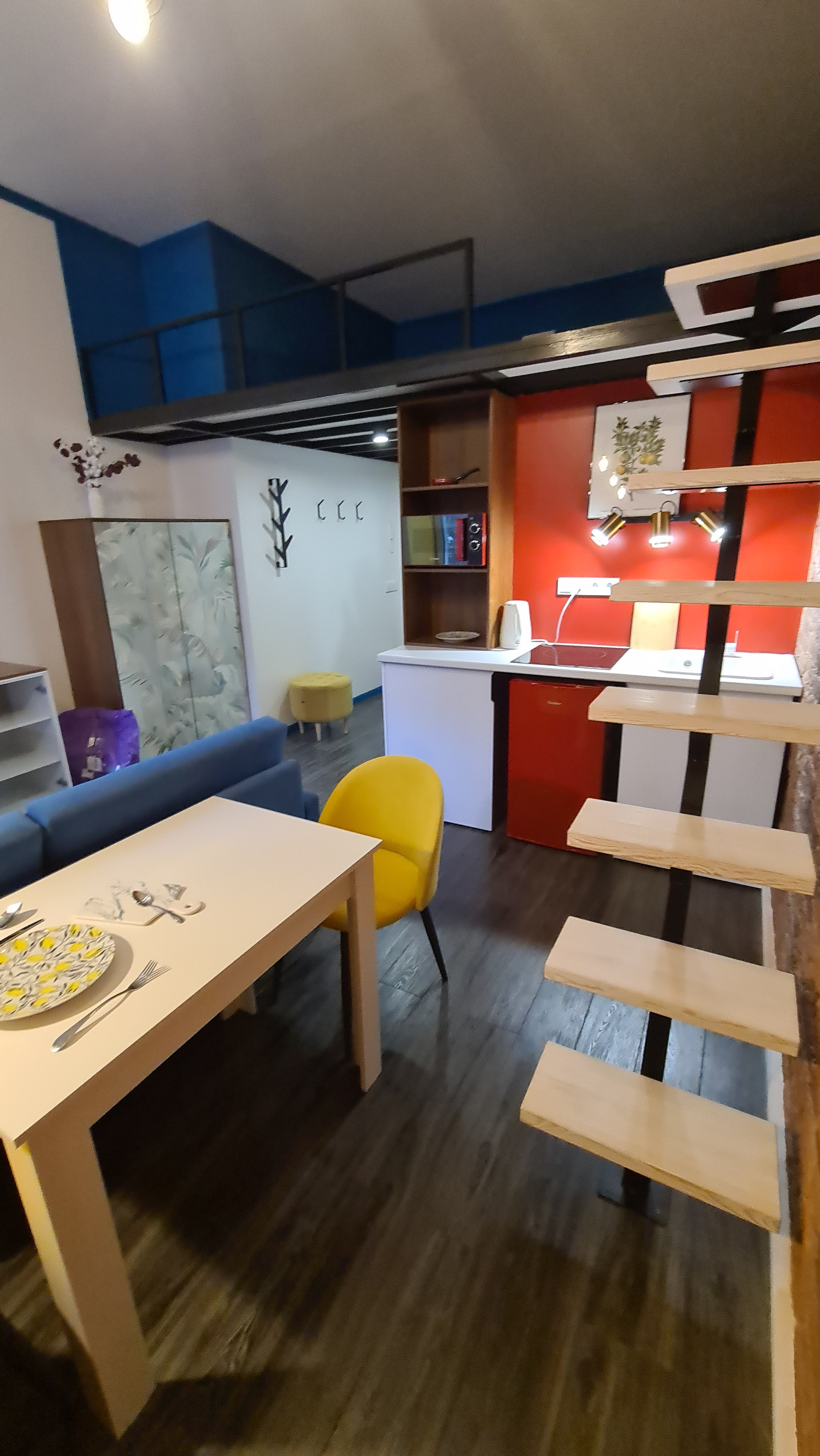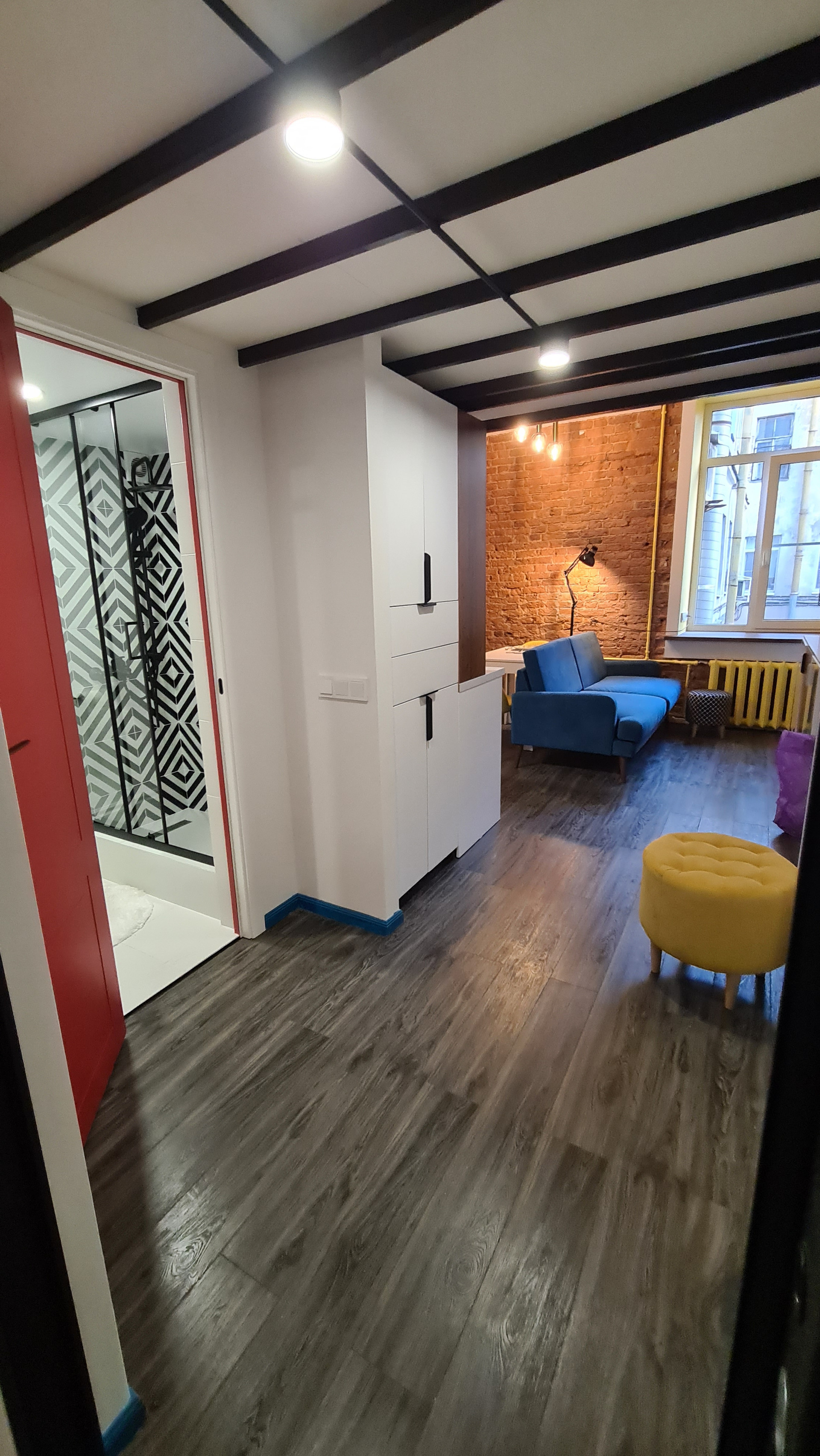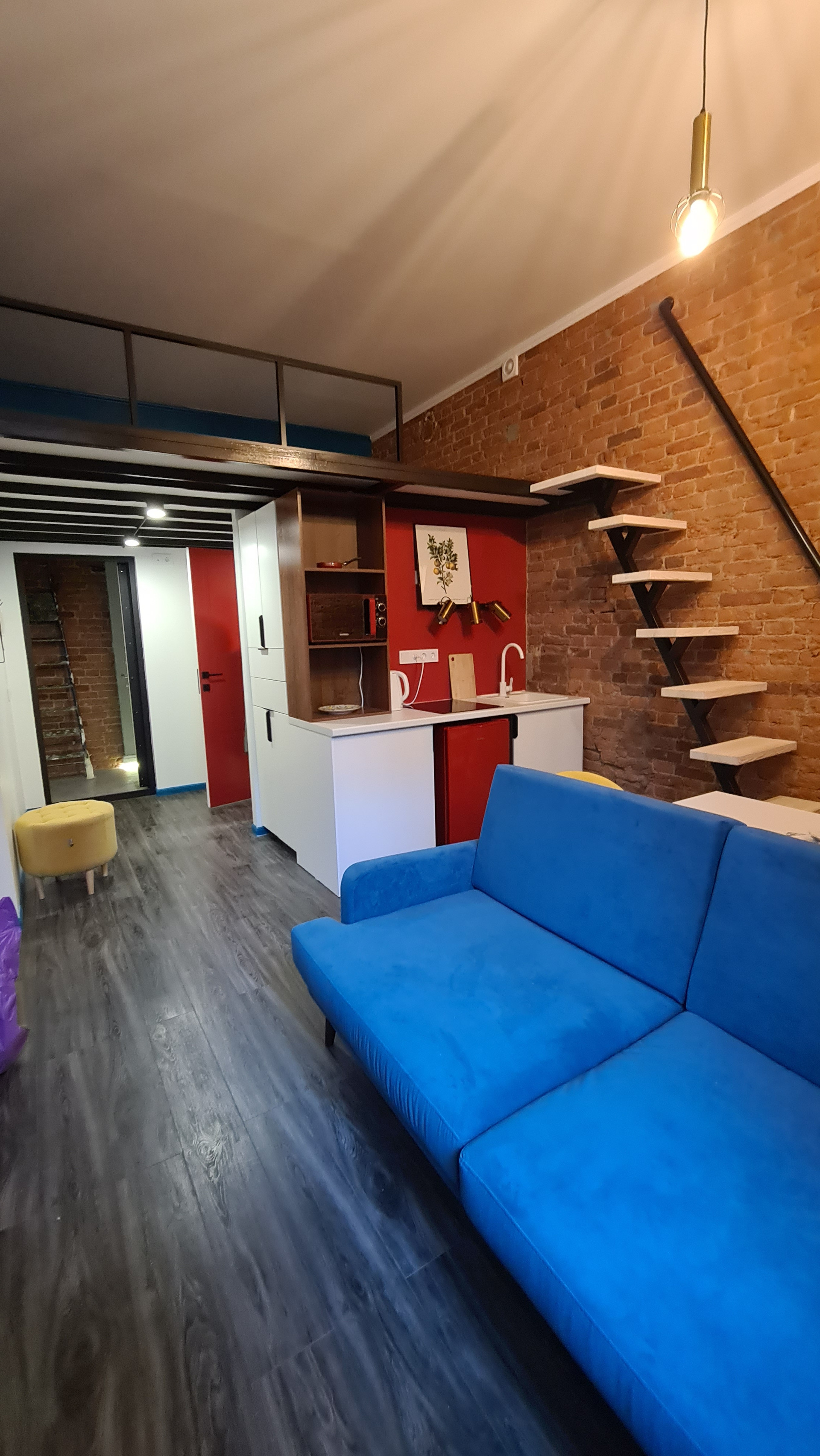Высота потолка - 3,45 м., позволила сделать второй ярус как спальное место что очень сэкономит жилое пространство.