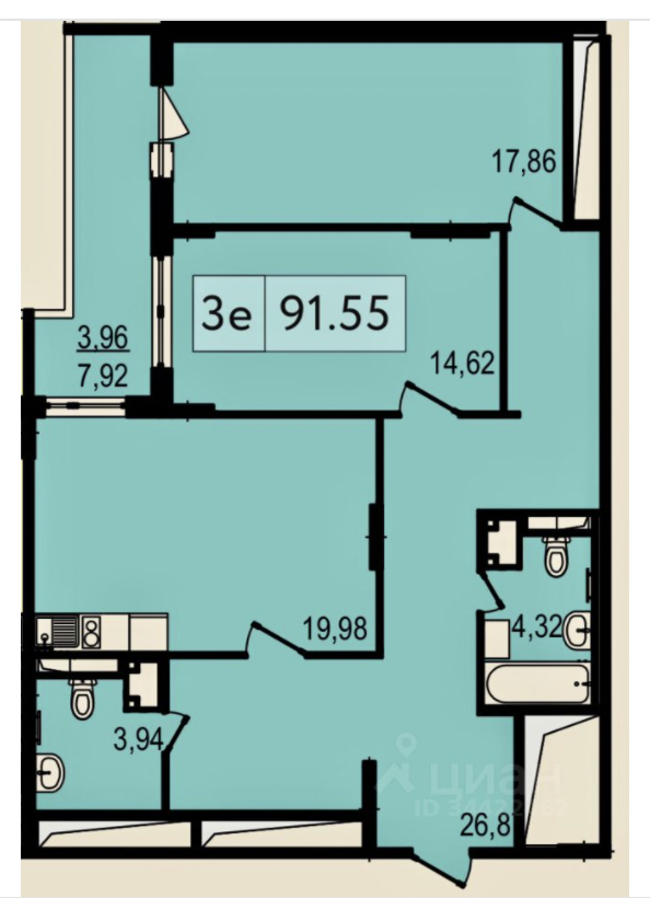 Общая площадь 91.5 м2