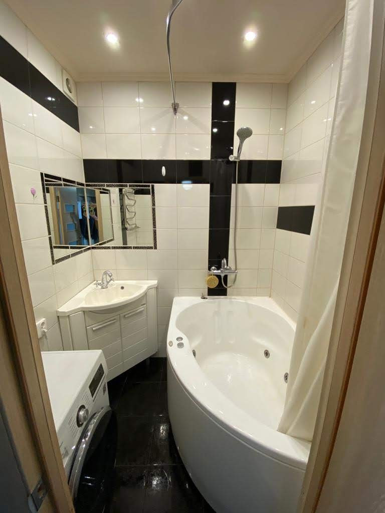 В ванной комнате: джакузи, новая стиральная машина, качественный кафель.