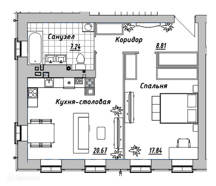 Продается от Застройщика однокомнатная «Евродвушка» с индивидуальным отоплением! Комната 17,84 + кухня-столовая 20,67м2.