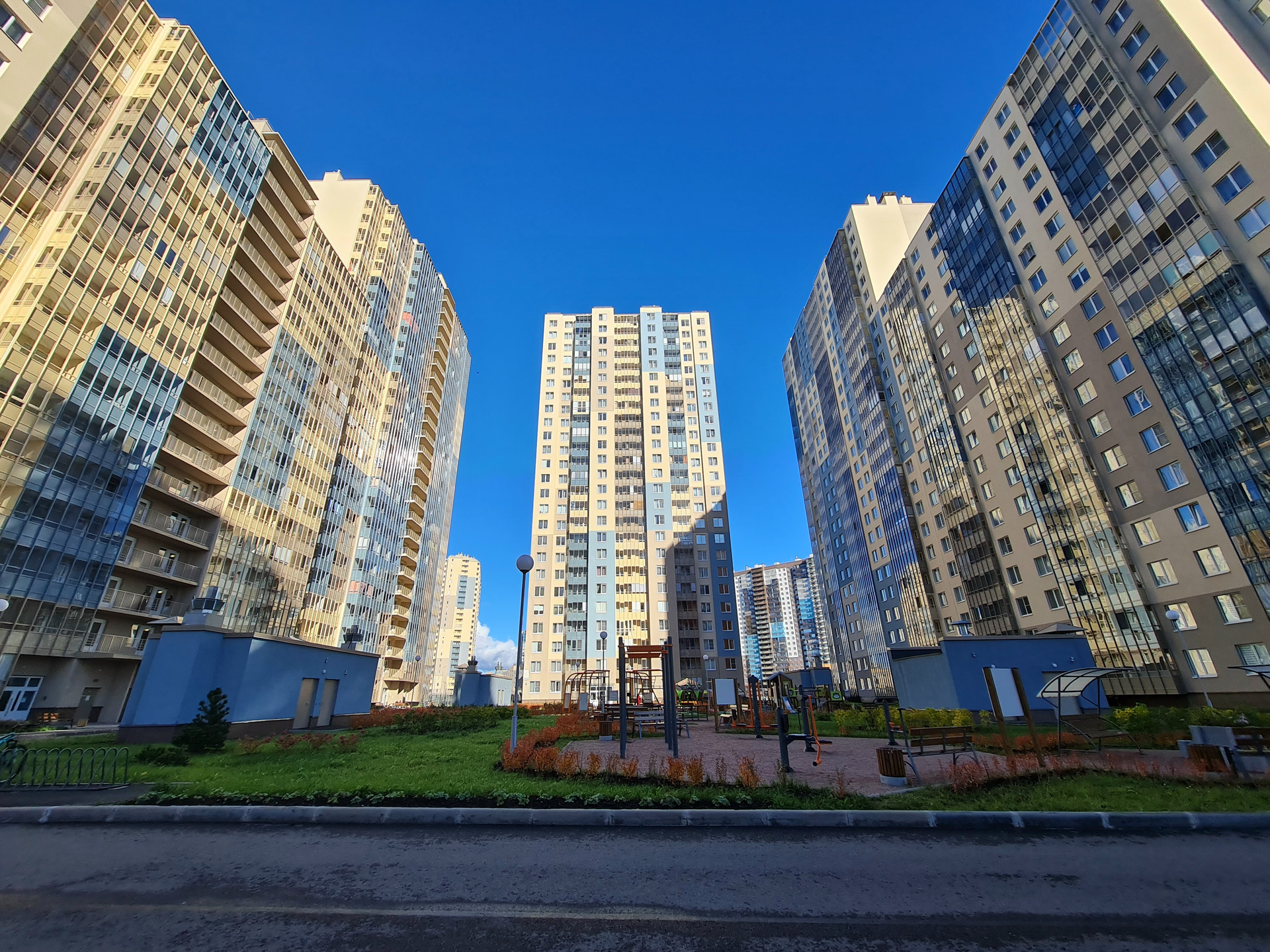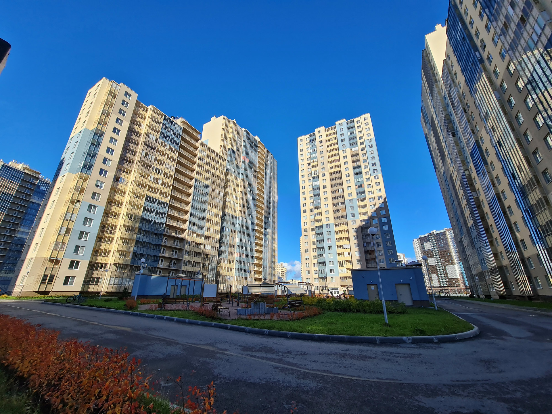 Территория благоустроена прогулочными зелеными зонами, бульварами, стадионом, а также площадью Солнца с фонтаном.