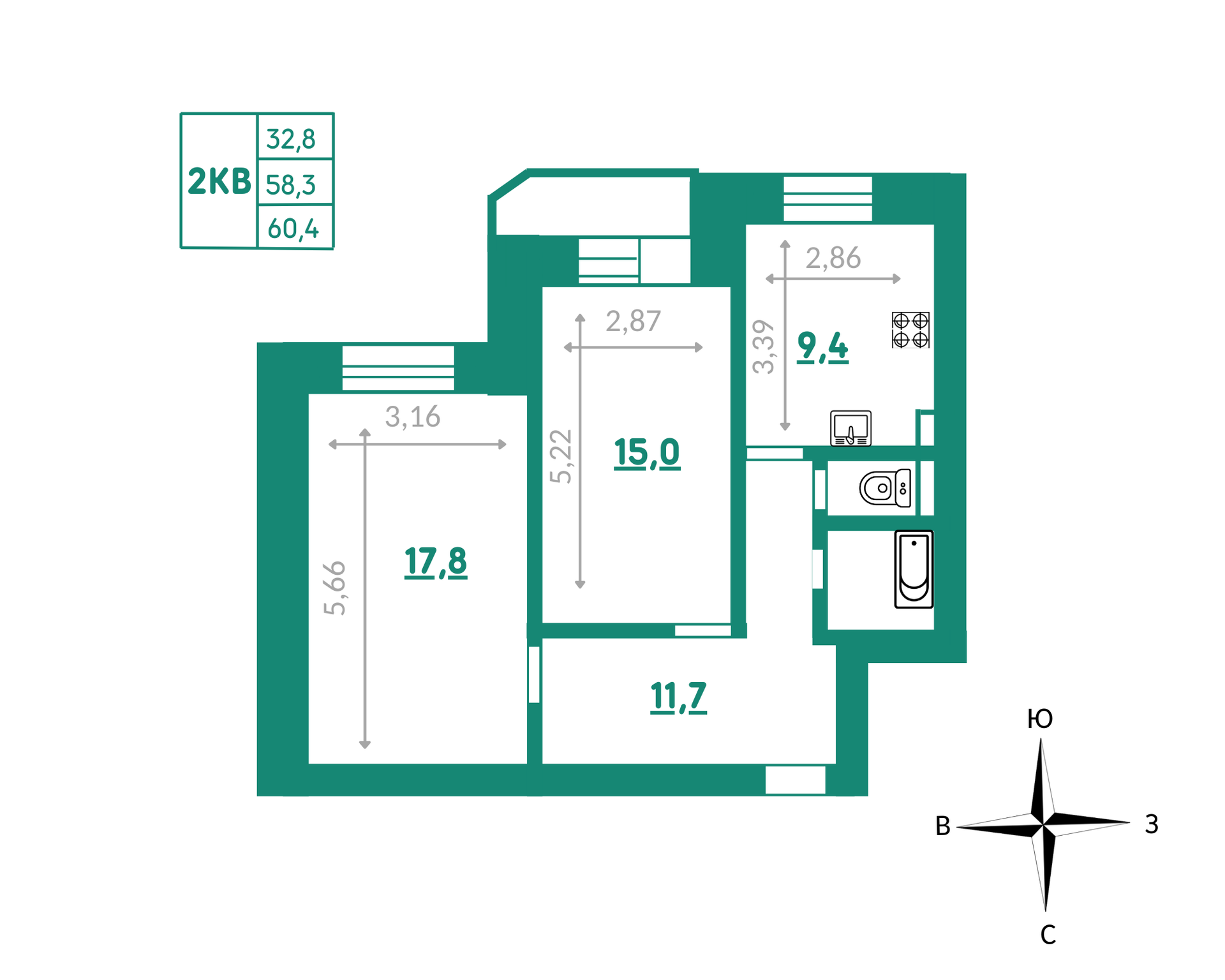 Общая площадь 58.3 м2