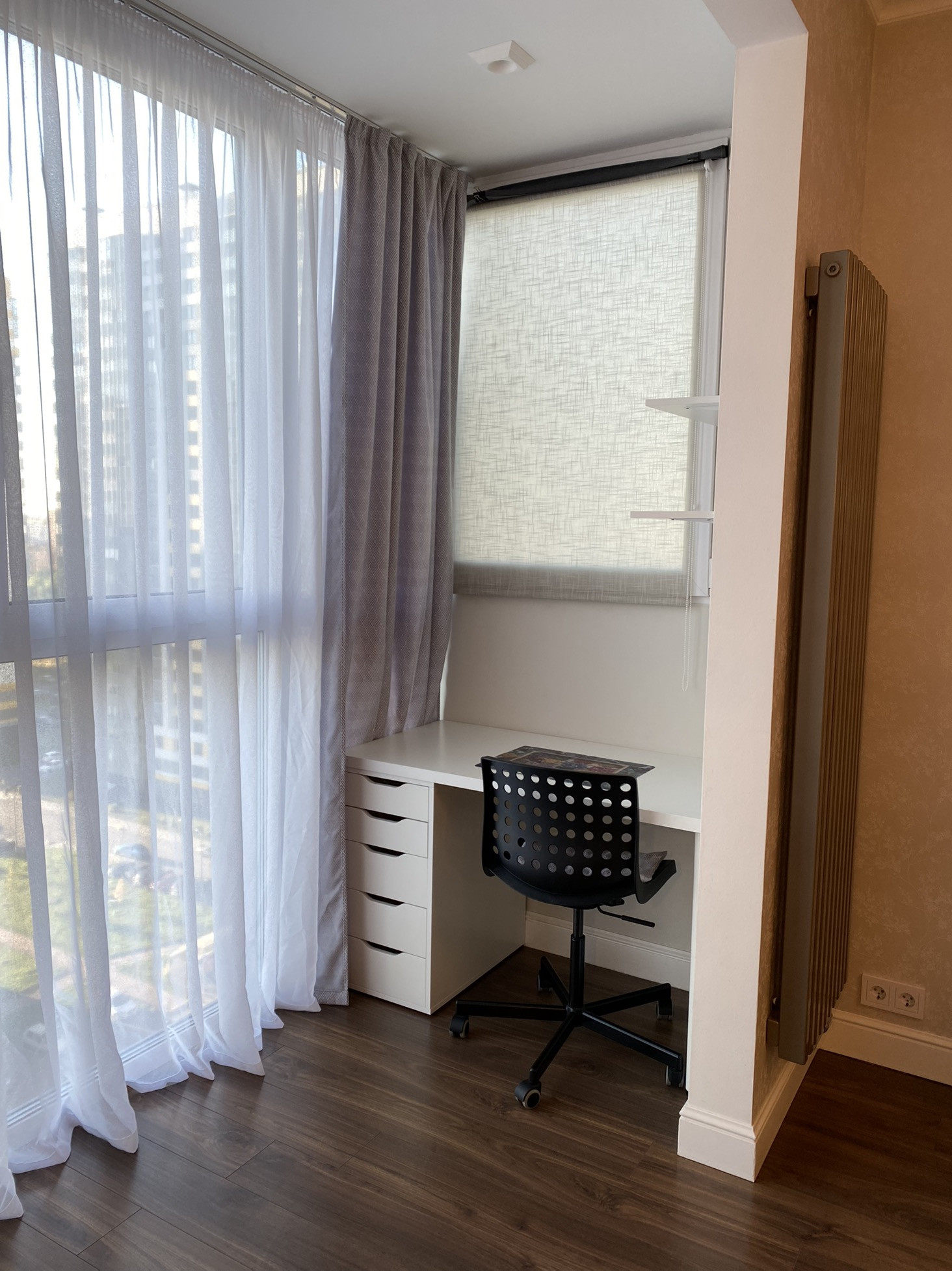 Есть удобное рабочее место, на тёплой лоджии.