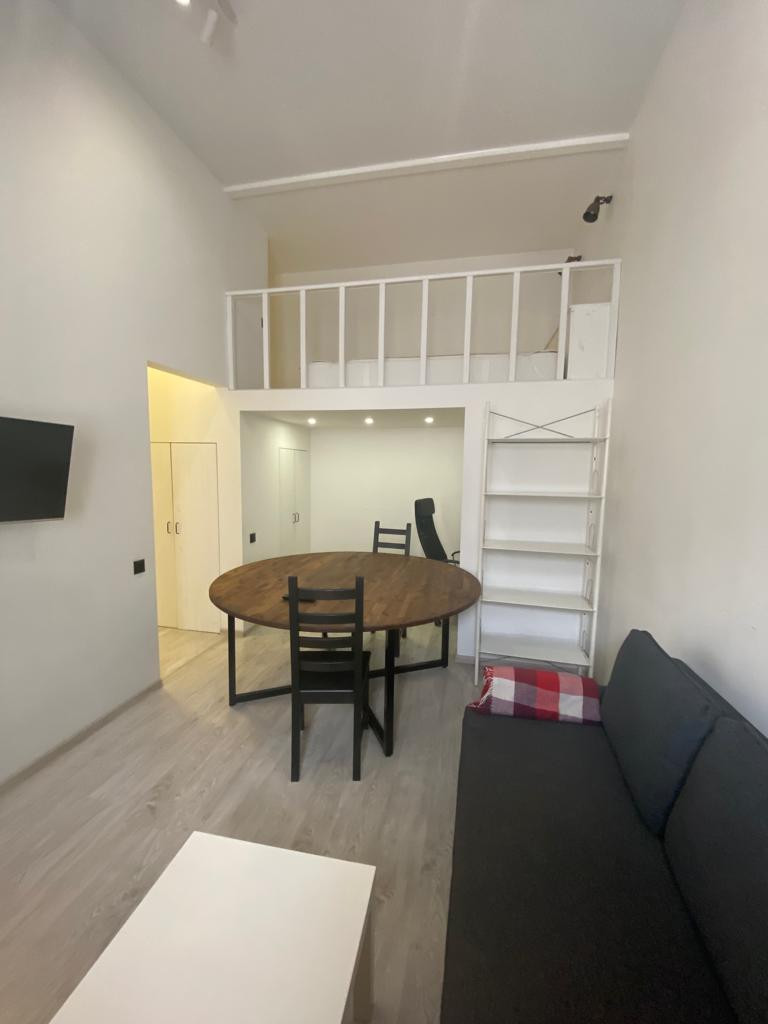 современный ремонт с минимальной амортизацией, оснащена техникой и кухней, ремонт в стиле лофт, большое количество света и пространство дают высокие потолки и наличие трех окон, надстроен второй этаж(спальное место), оформлена рабочая зона с освещением, гардеробная.
