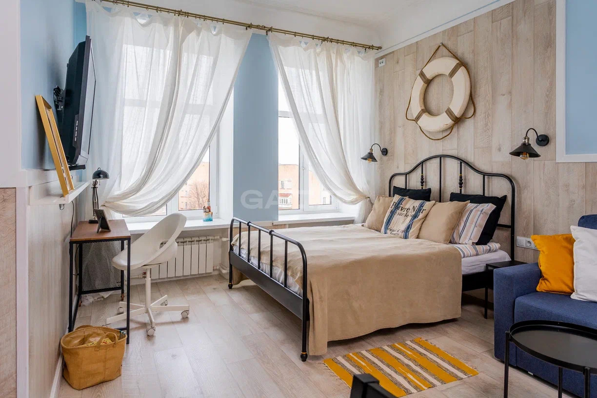 В комнате в морской тематике на стенах висят вырезки из газет - ими были обклеены стены квартиры, всё восстановили и таким образом использовали в дизайне квартиры.