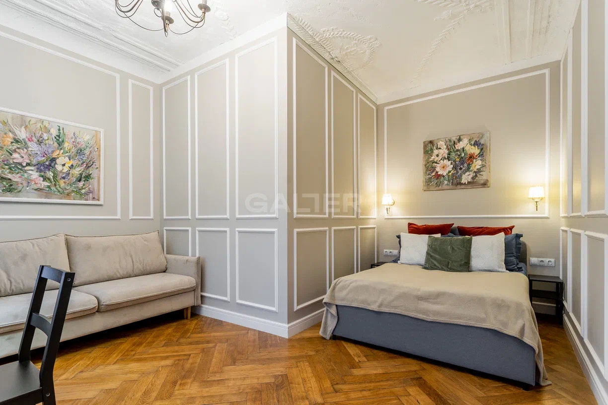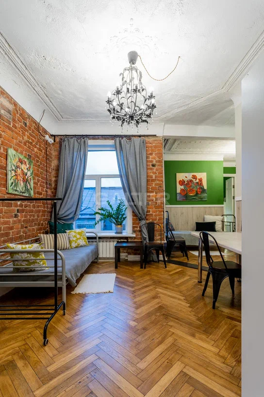 В квартире сохранена оригинальная лепнина, дубовые полы, кирпичная стена в одной из квартир также оригинальная, в ней заделан дымоход (это фасадная стена + последний этаж, все технические характеристики позволяют при желании сделать камин).