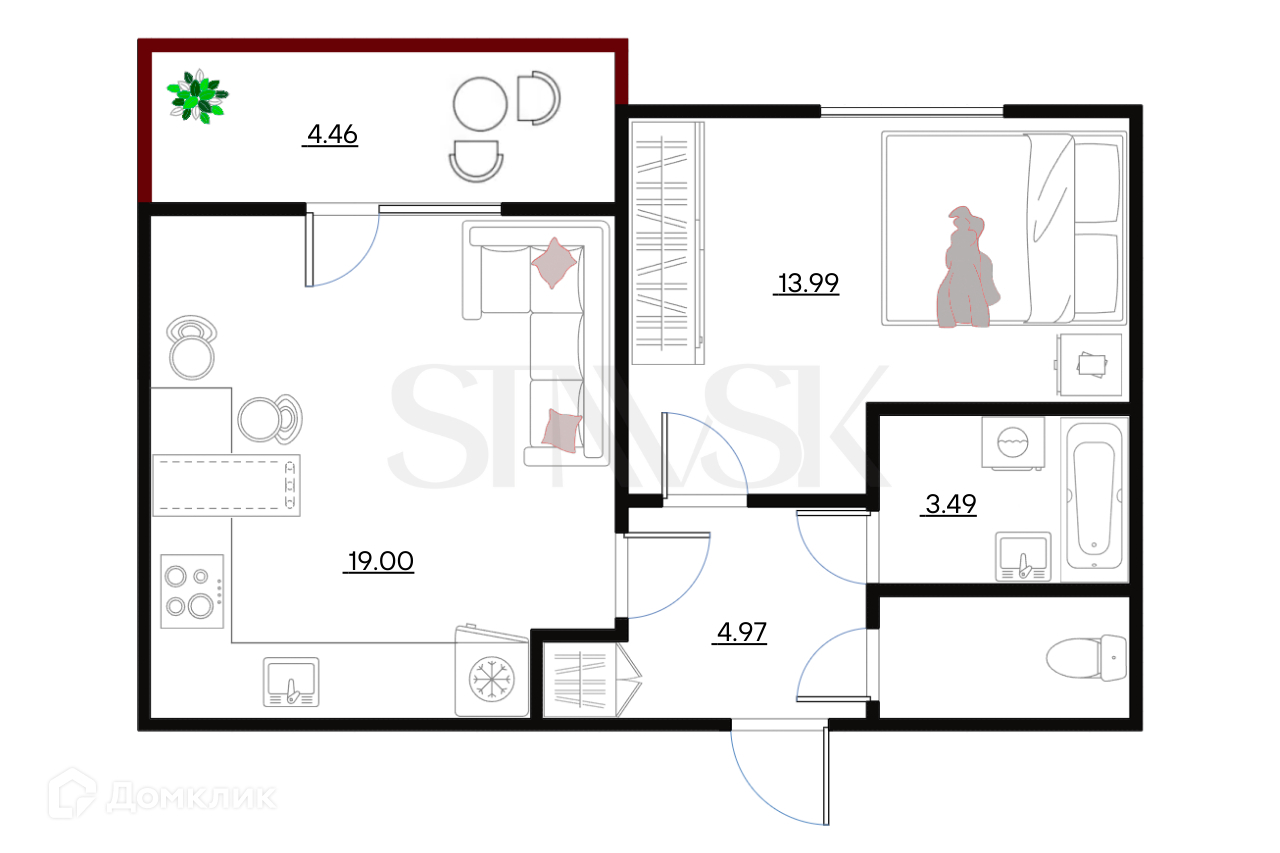 Санузел раздельный, что редко для однокомнатных квартир. Пластиковые окна.