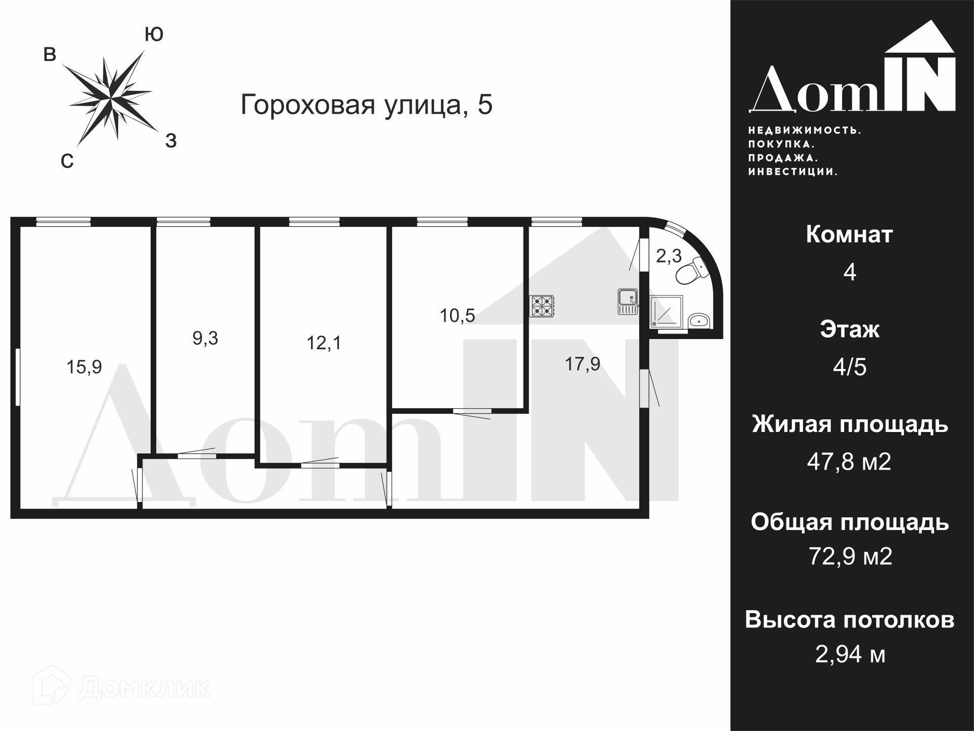 4-комнатная квартира, 72.9 м2, этаж 4 / 5, на продажу в Санкт-Петербурге, Гороховая улица, 5