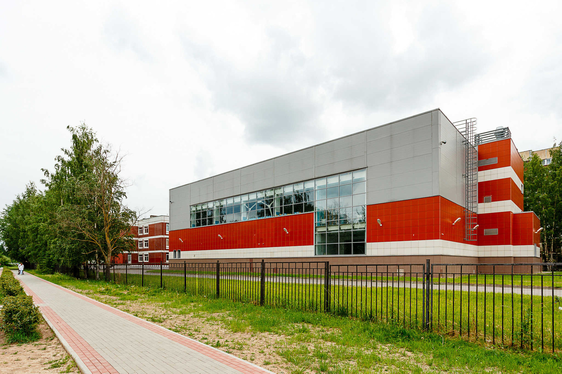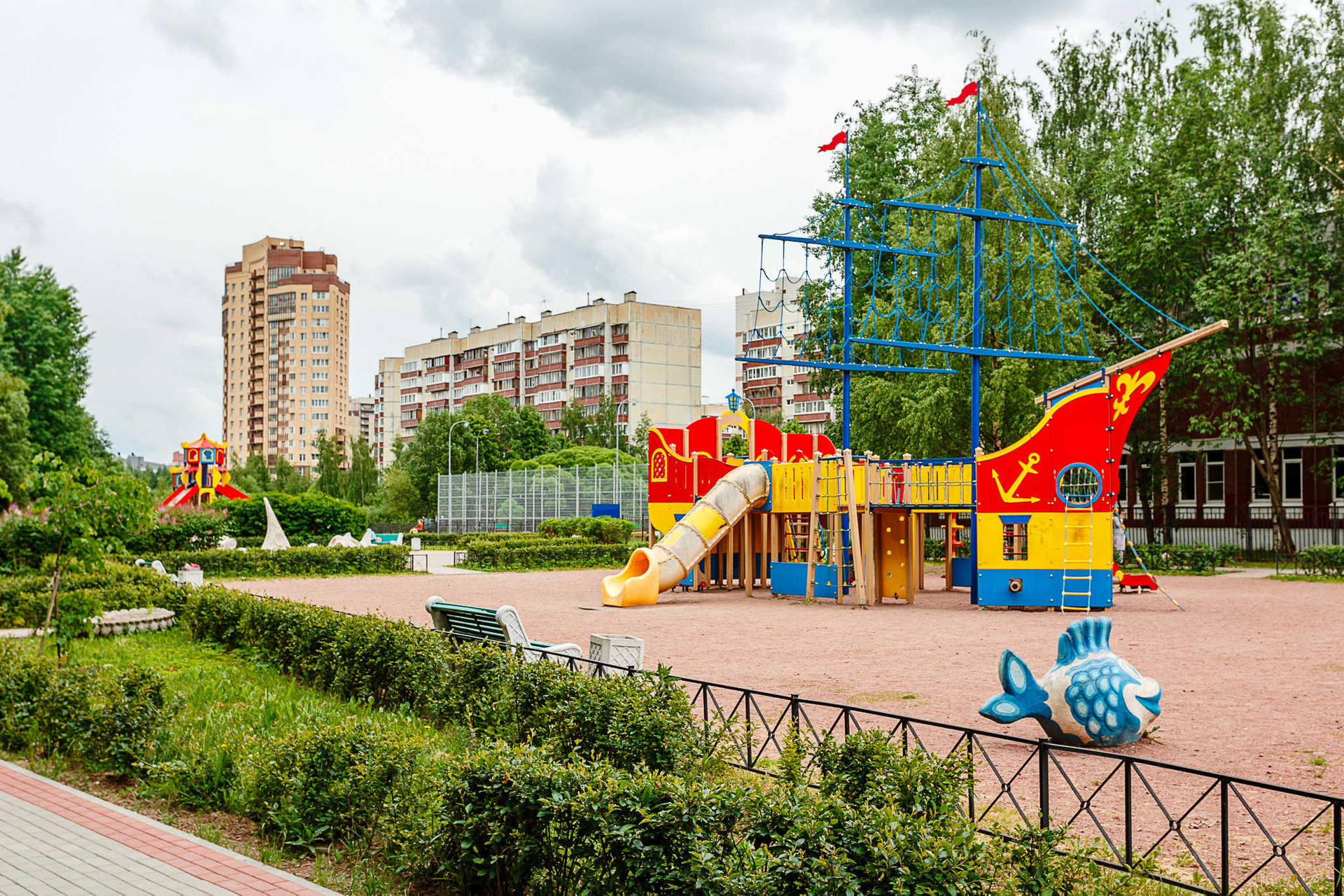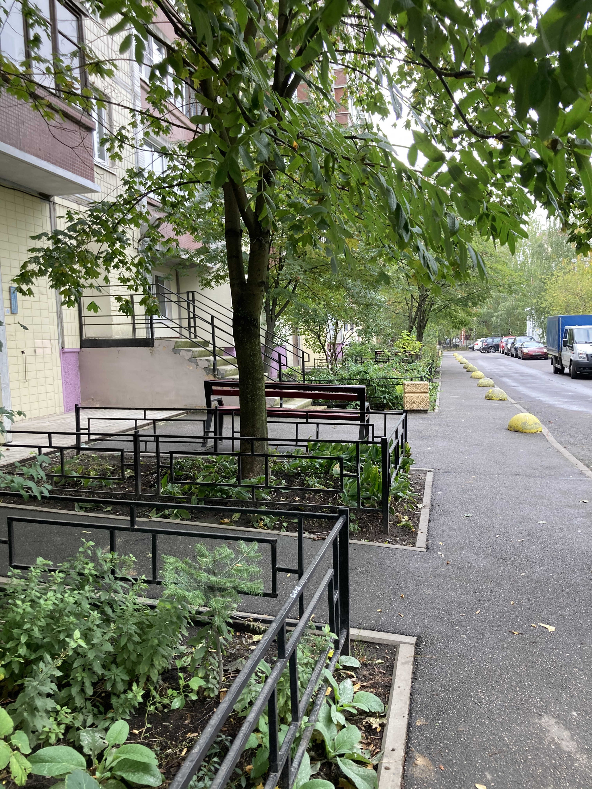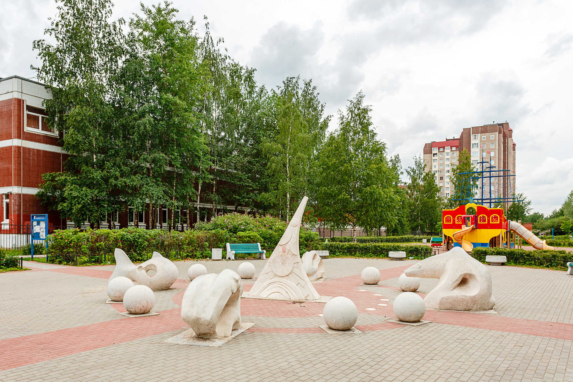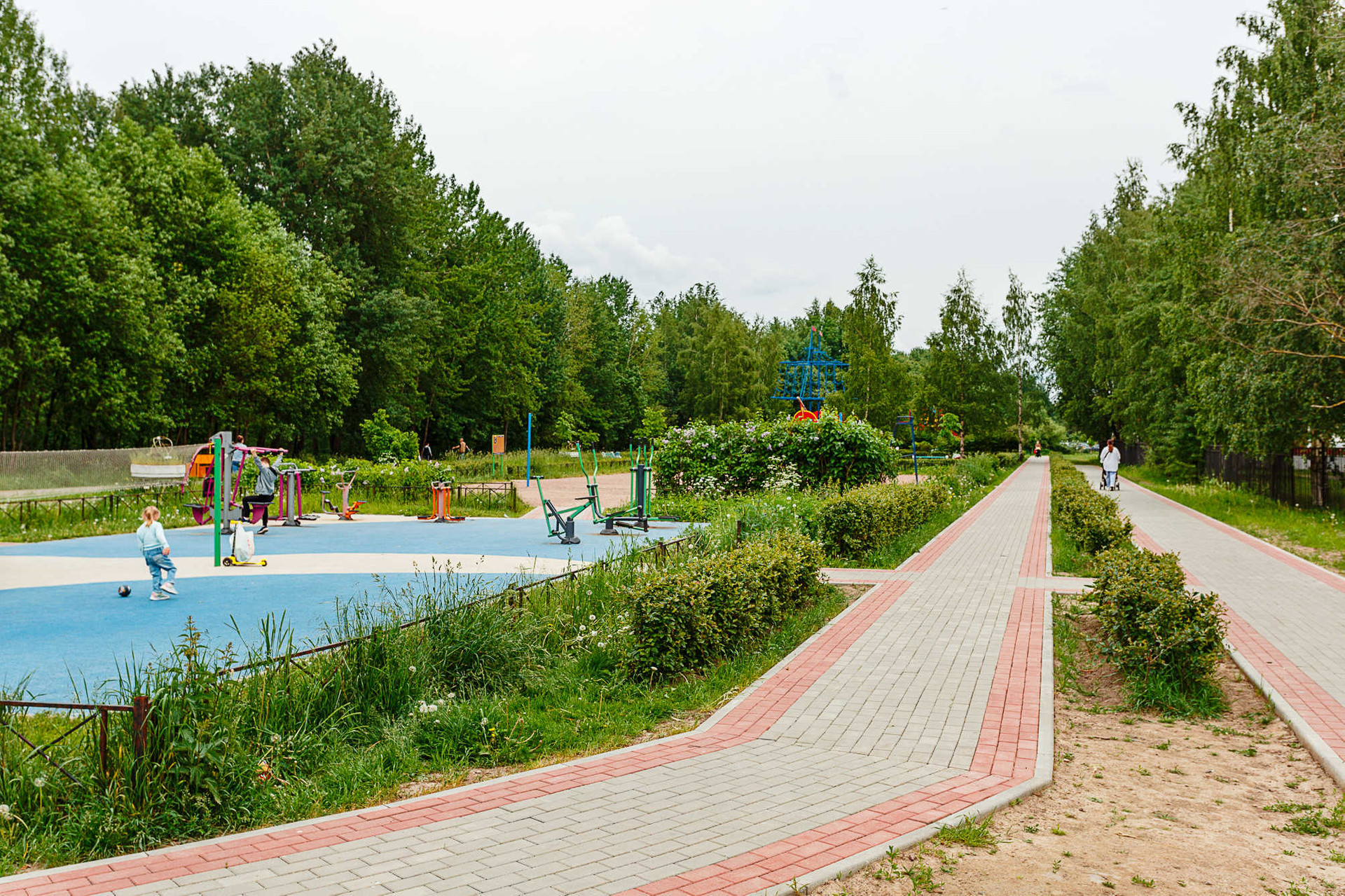 Во дворе английская школа с бассейном, а сразу за ней детский сад. Через реку есть пешеходный мостик в обширный по площади Яблоновский сад.