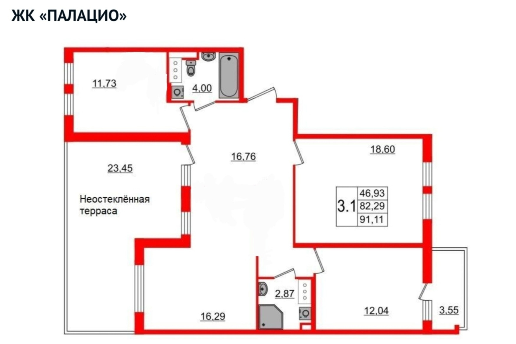 Общая площадь 91 м2