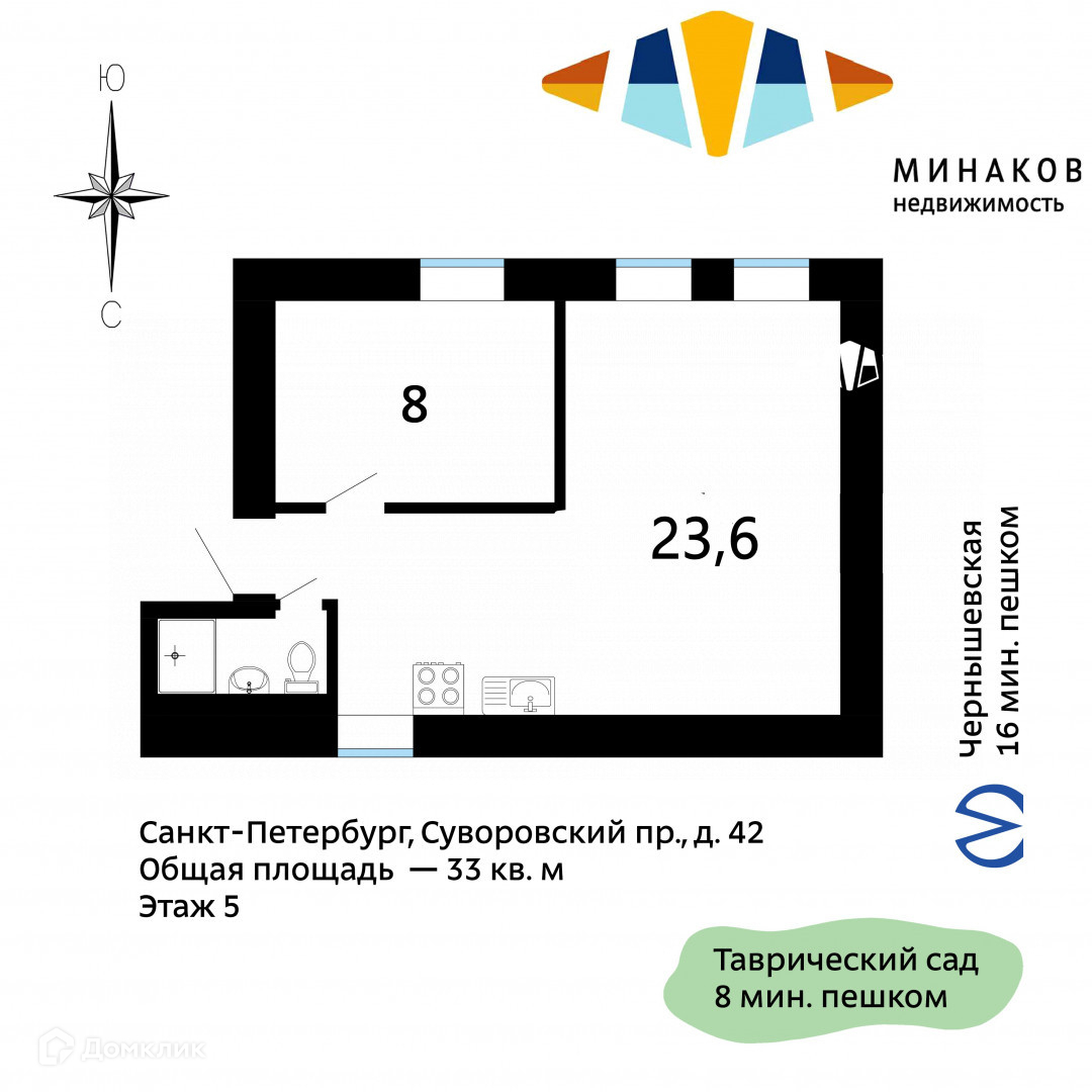 1-комнатная квартира, 33 м2, этаж 5 / 5, на продажу в Санкт-Петербурге, Суворовский проспект, 42