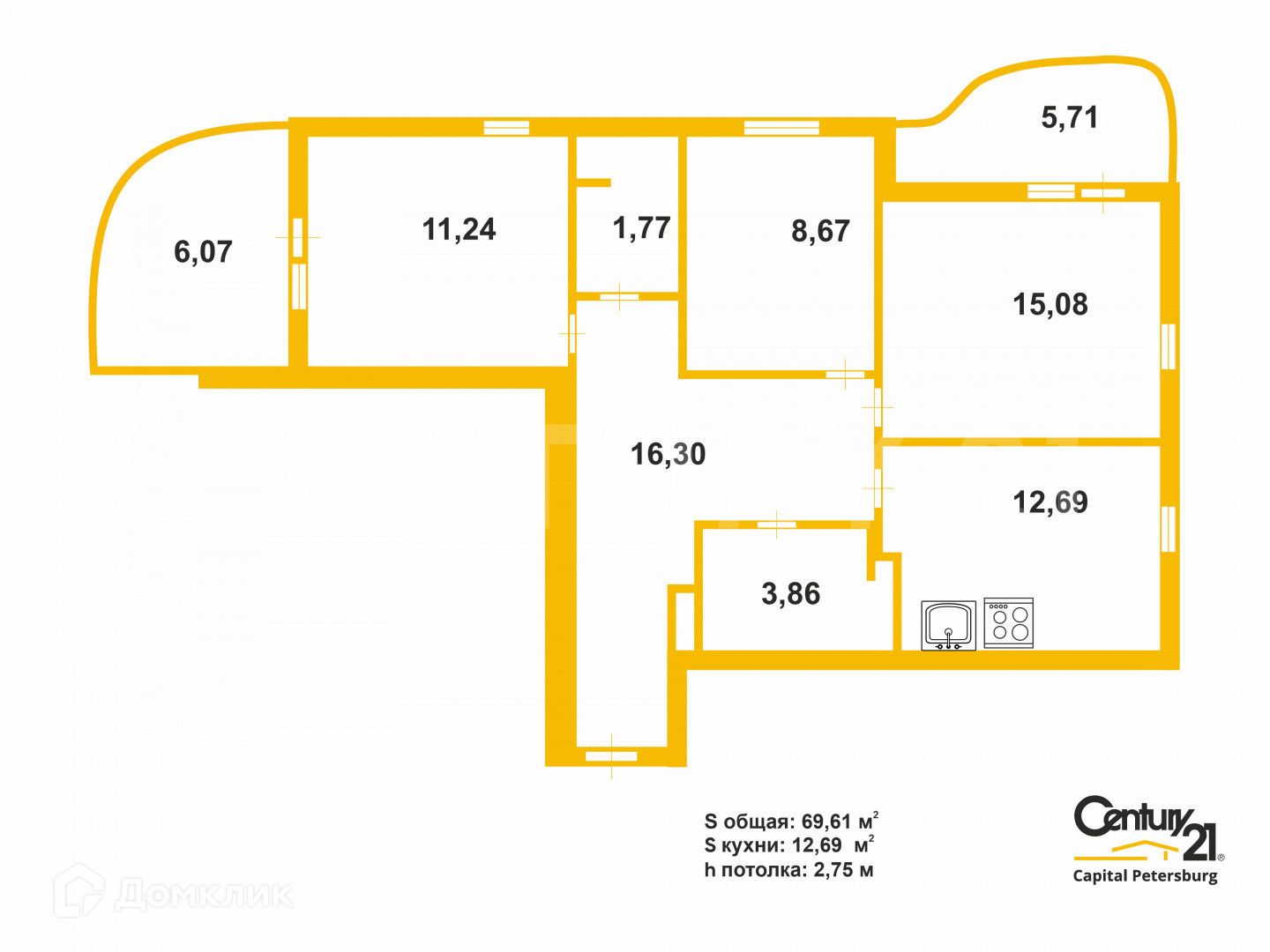 Площадь кухни 12.69 м2