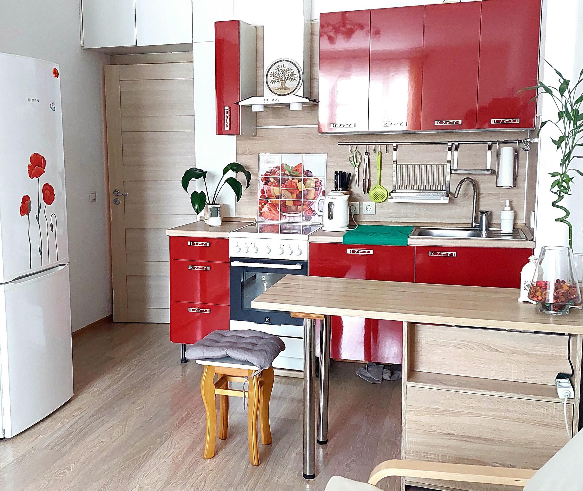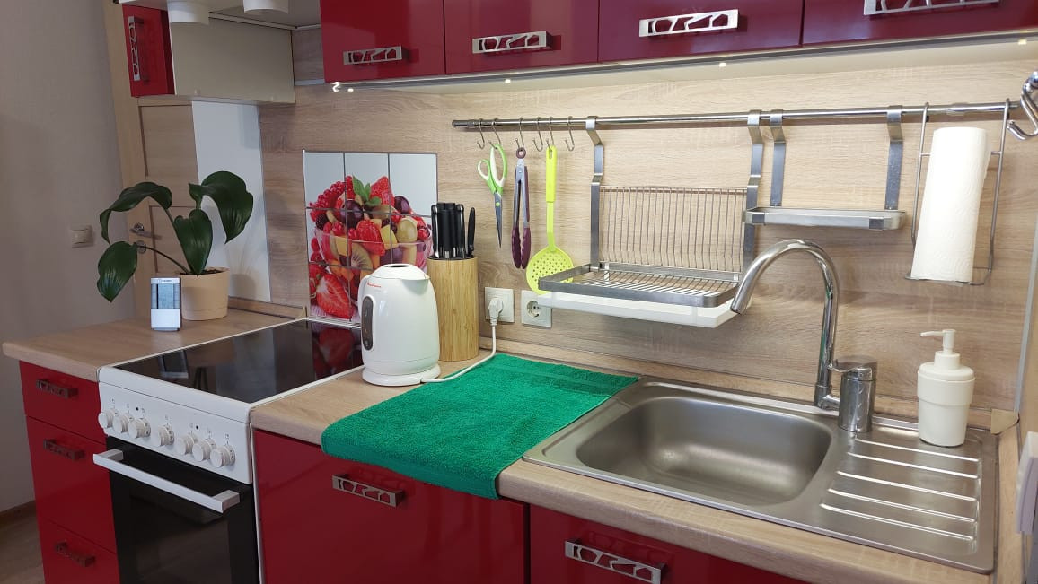 - Полностью функциональная кухонная зона с подсветкой, ПОЛНОЦЕННОЙ плитой Electrolux на 4 конфорки и духовкой, а так же достаточным количеством шкафов для кухонных принадлежностей.