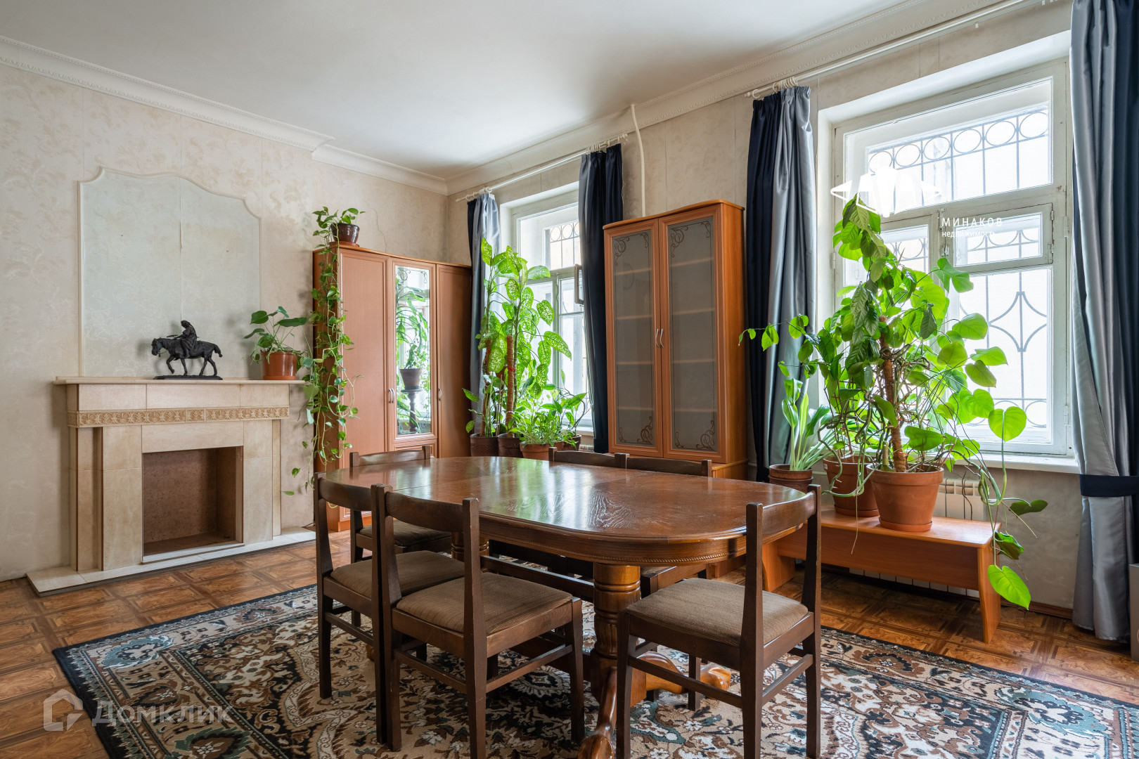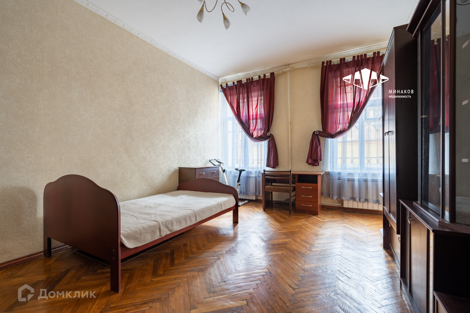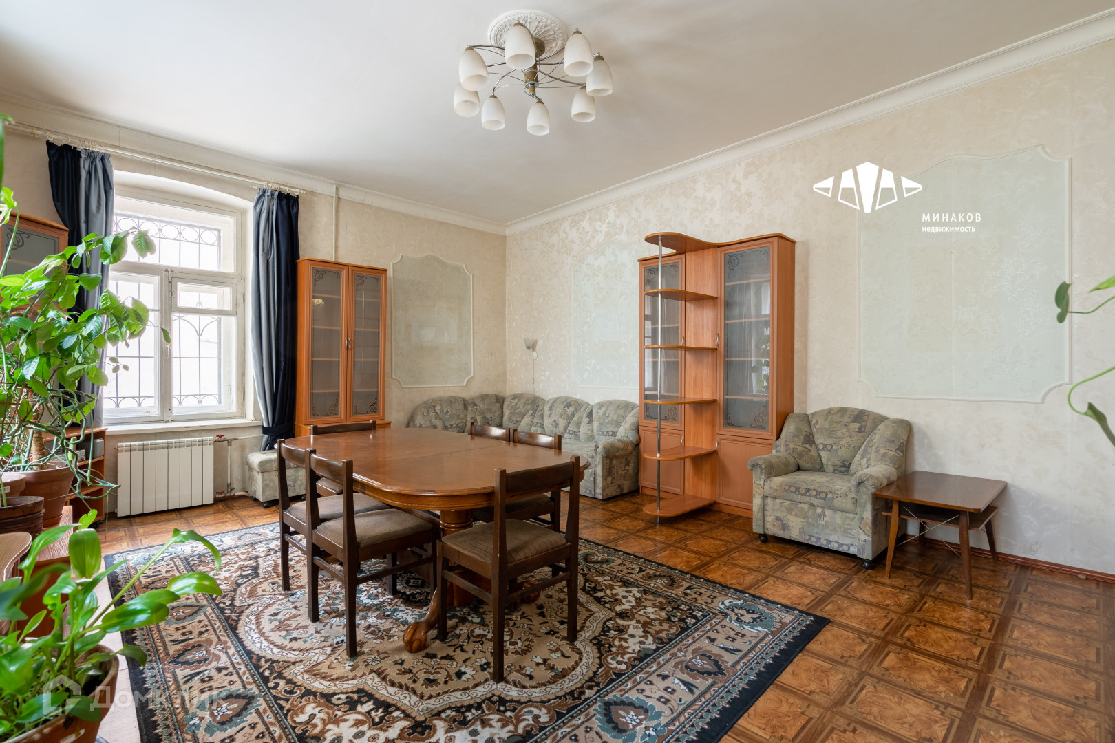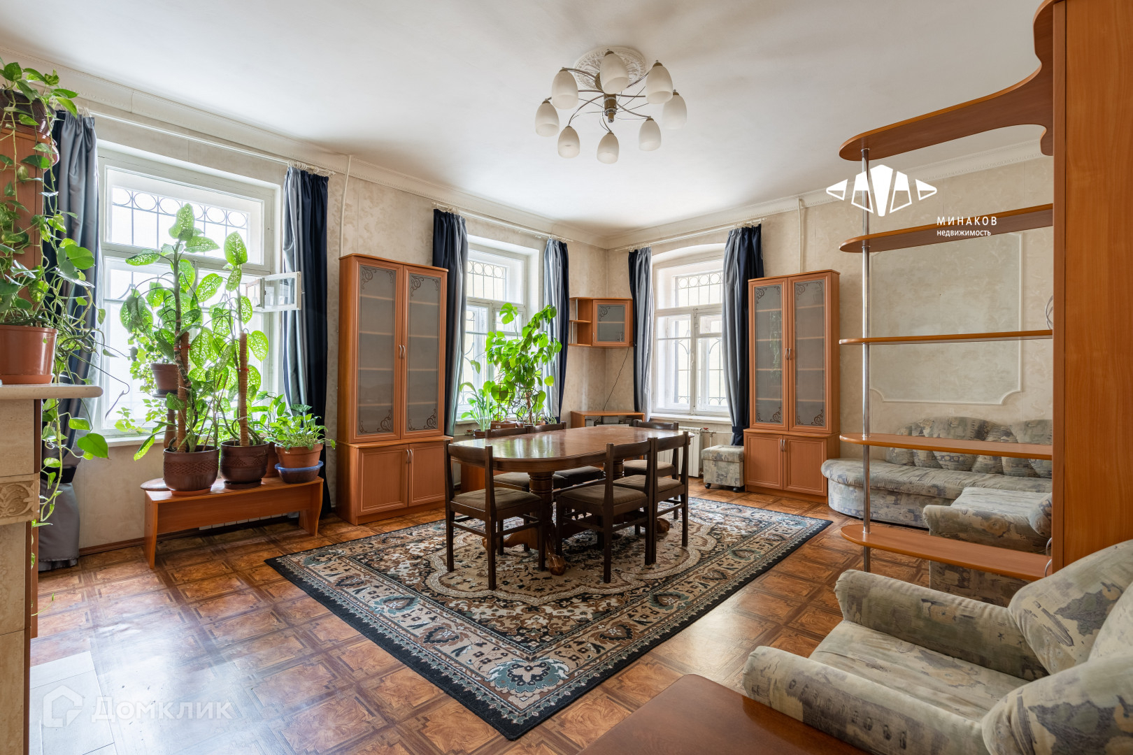 Окна выходят на три стороны. Железобетонные перекрытия, ухоженный паркет, высокий потолок - 3,2 метра. Новому собственнику остается кухня с плитой и холодильником, стиралка, посудомойка, а также, при необходимости, мебель.