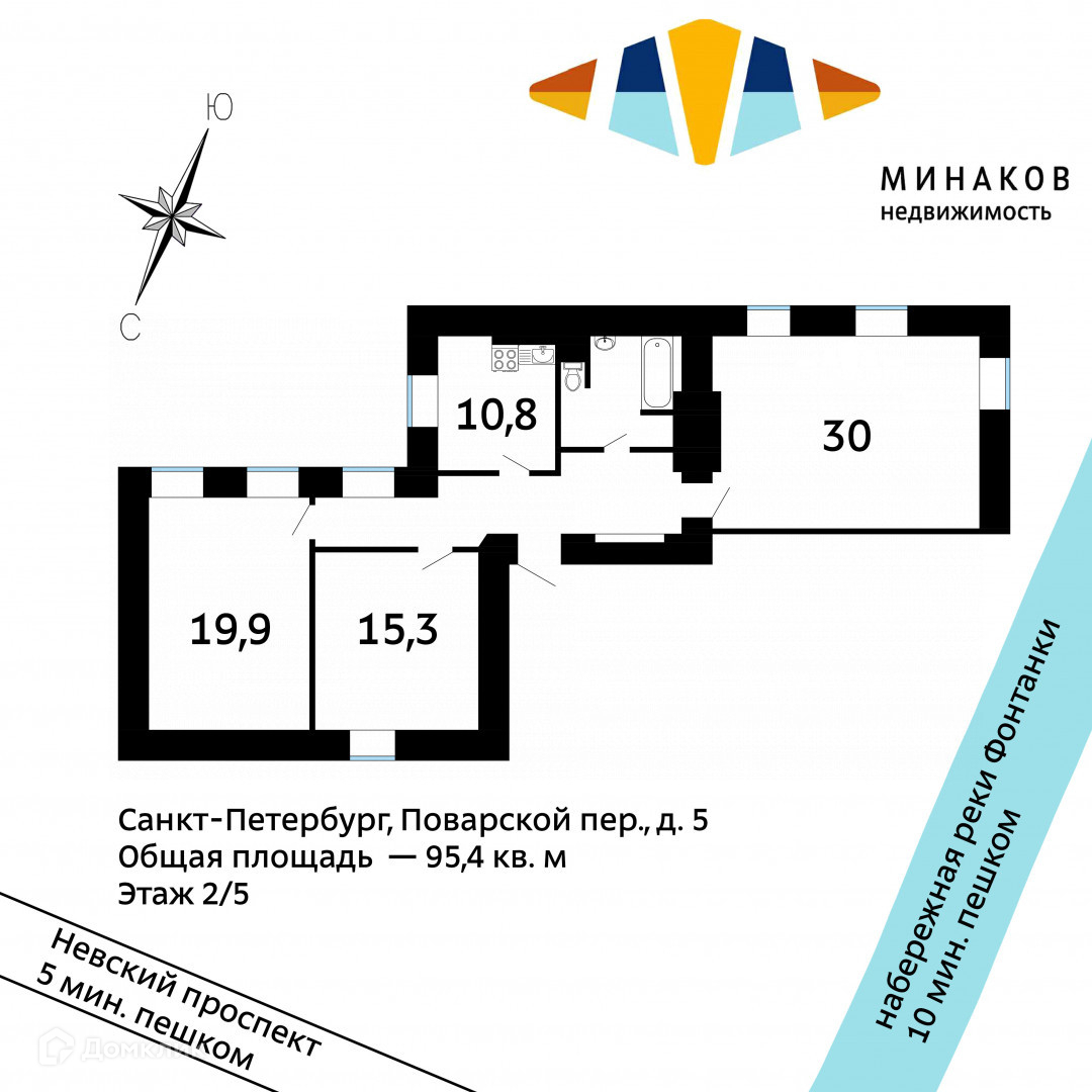 3-комнатная квартира, 95.4 м2, этаж 2 / 4, на продажу в Санкт-Петербурге, Поварской переулок, 5