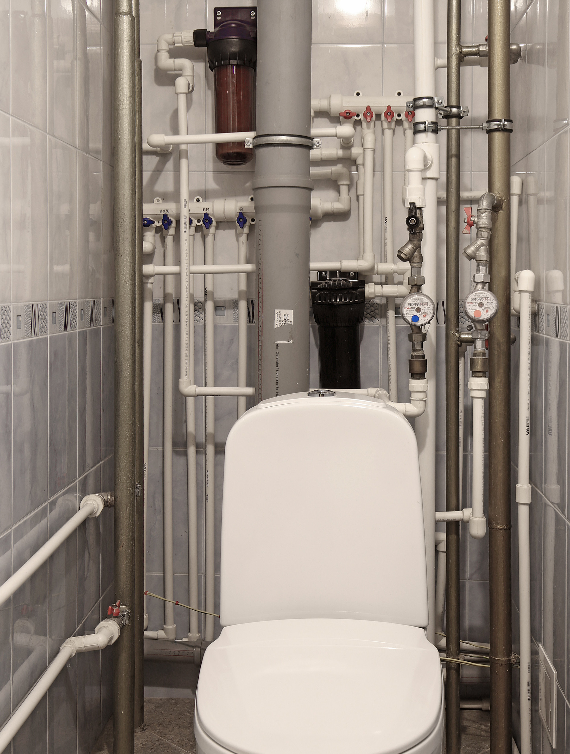 17) Сантехнические коммуникации не зашиты в стену, а дизайнерски оформлены в стиле «Трубопровод Windows». Такое небанальное решение не только даёт глазу за что зацепиться, но и решает проблему доступности для ремонта, управления и быстрого обнаружения протечки.