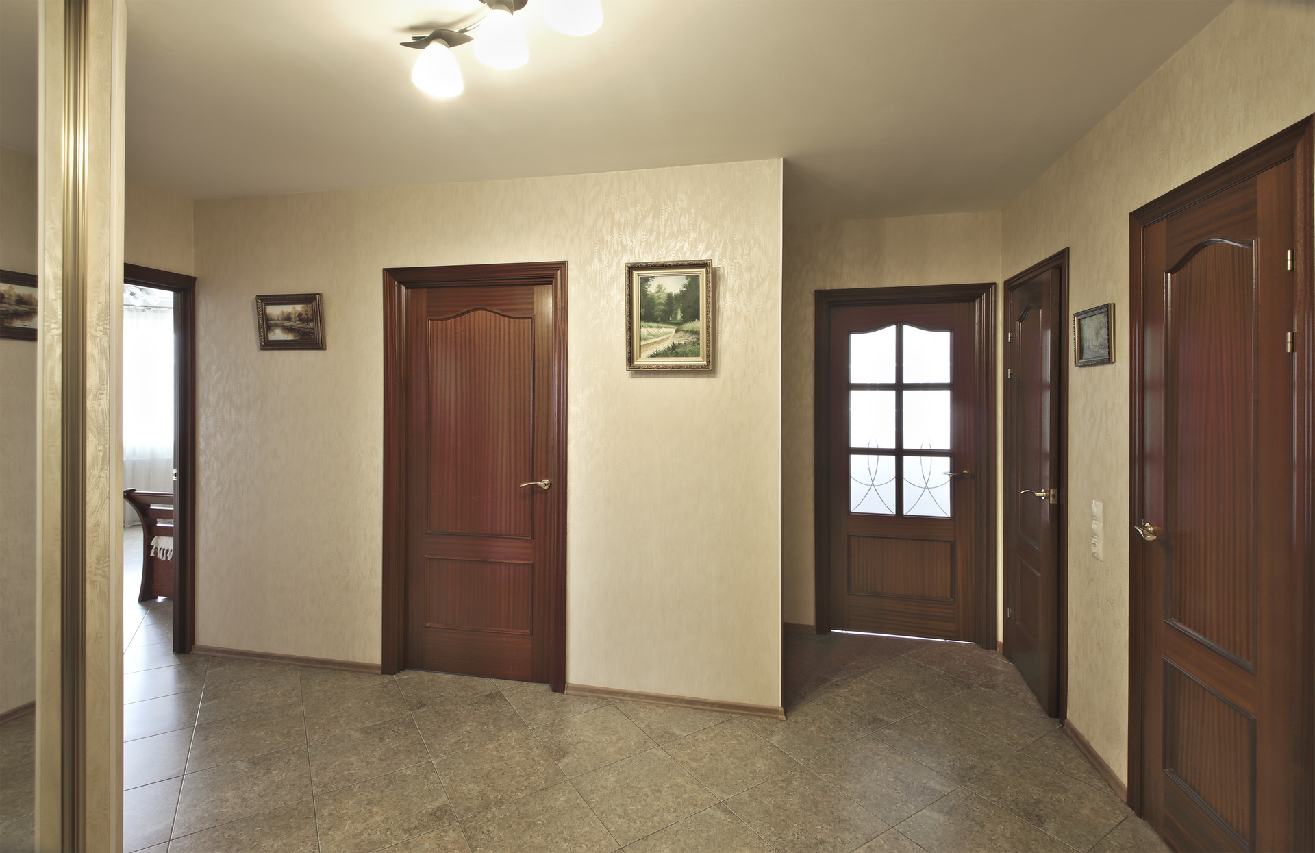8) В коридоре 2 ёмких встроенных зеркальных шкафа, разделённых полуколонной. Безопасные зеркала от пола до потолка во всю ширину визуально увеличивают и без того просторный коридор, полуколонна вместо тупого угла добавляет изящества, а неправильная форма коридора визуально делает его ещё интереснее.