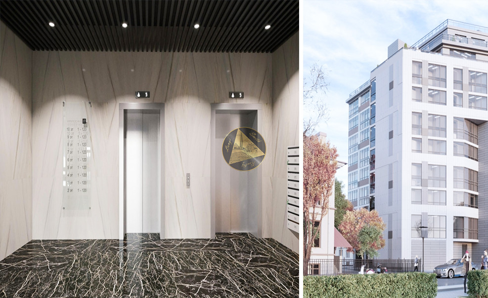 - Апартаменты занимают 2-10 этажи, на 1 этаже лобби и служба быта, конференц-зал, фитнес-клуб, кафе и магазины, на 0 этаже предусмотрен подземный паркинг на 80 автомобилей и гостевая автостоянка на 10 машиномест.
