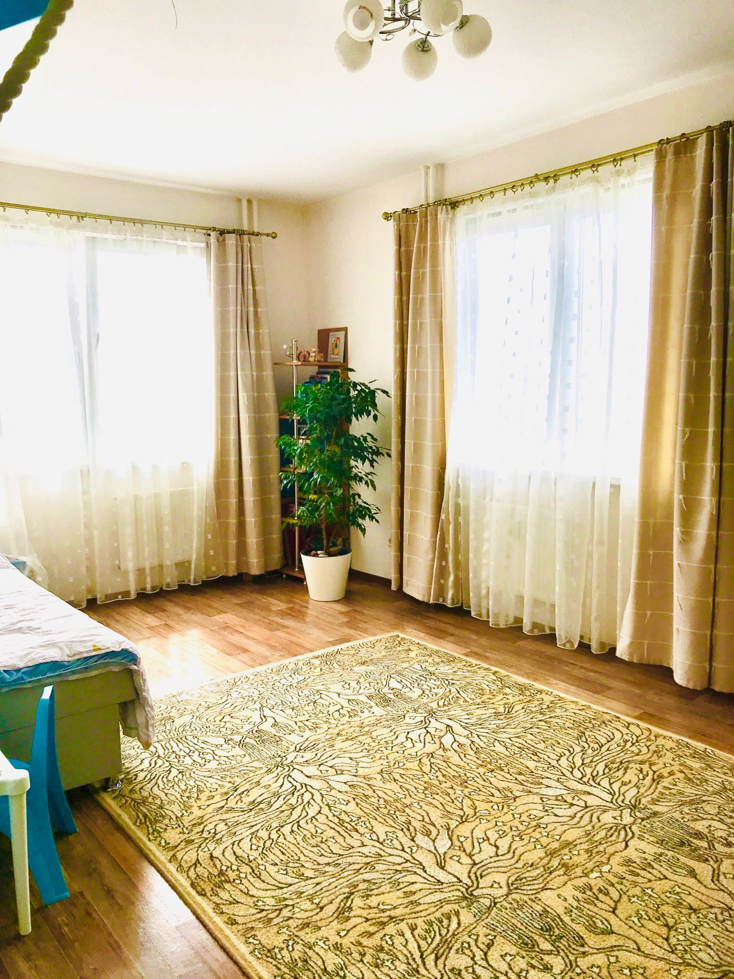 При заселении была произведена небольшая перепланировка, а именно в средней комнате (на плане с балконом) снесли стену( не несущую), таким образом комната 20 метров, используется как гостиная.