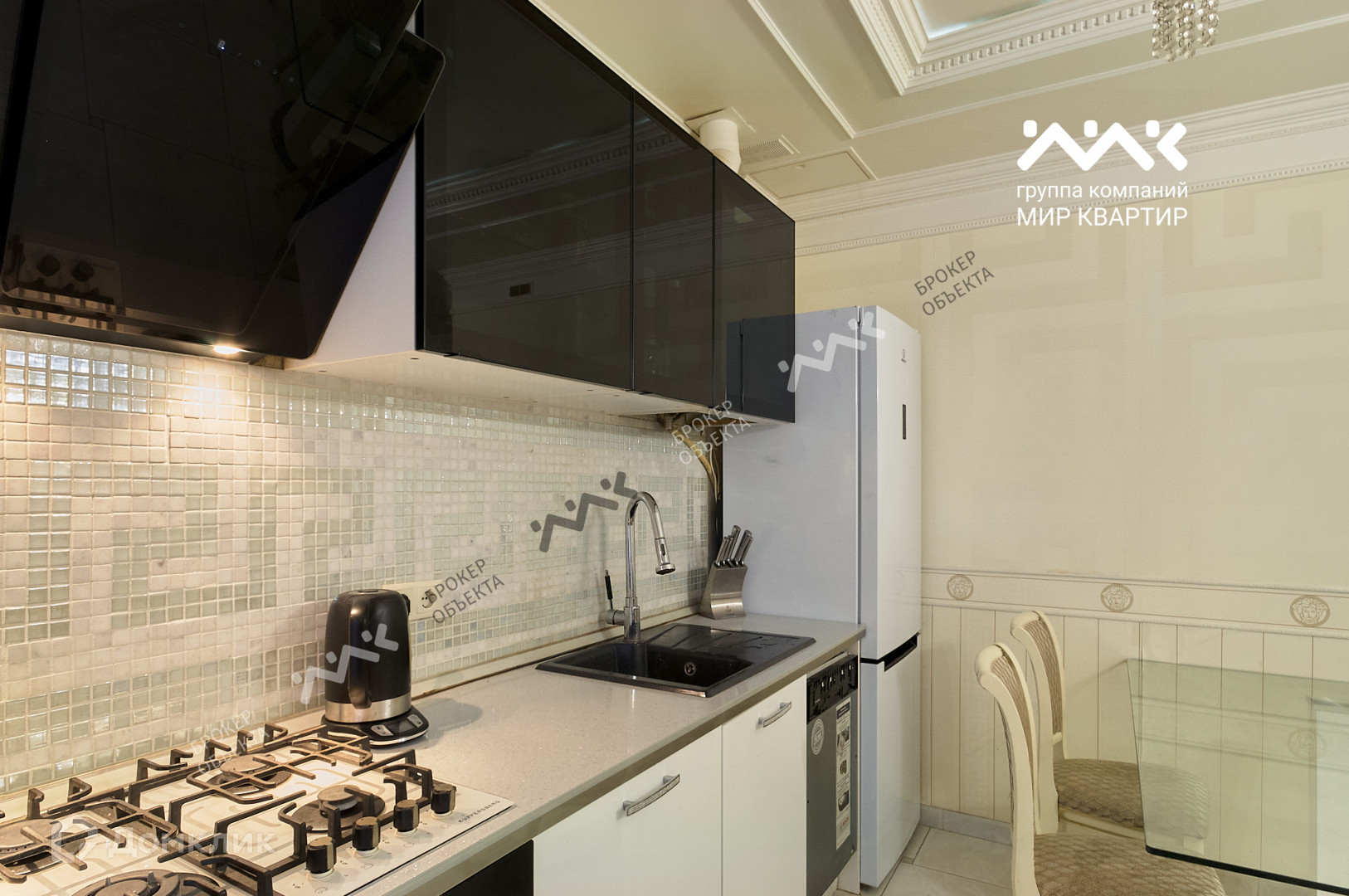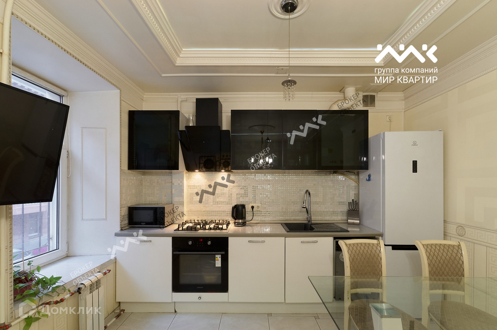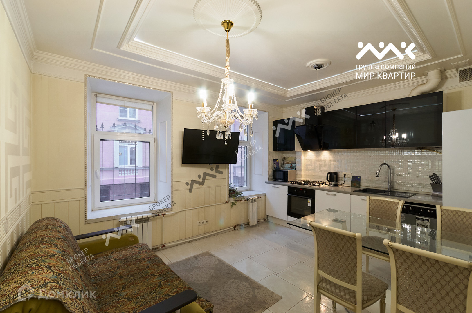 - выполнен ремонт по дизайн-проекту, красивые подвесные потолки с лепниной, использовались качественные материалы, а также люстры, светильники, двери, мебель известных брендов;