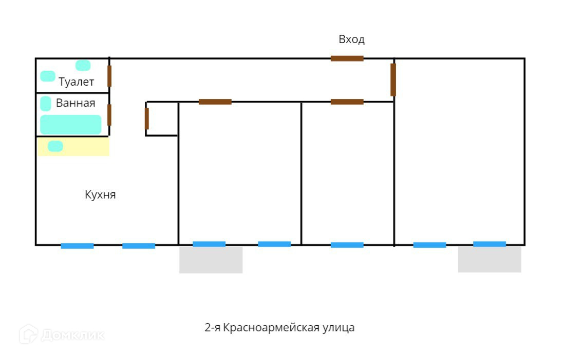 Трехкомнатная квартира, все окна и два балкона выходят на 2 Красноармейскую - тихую улочку с зеленью. Прямо перед домом участок гибдд, то есть ваши окна не упираются в чьи то другие окна. Всегда солнечно и уютно.