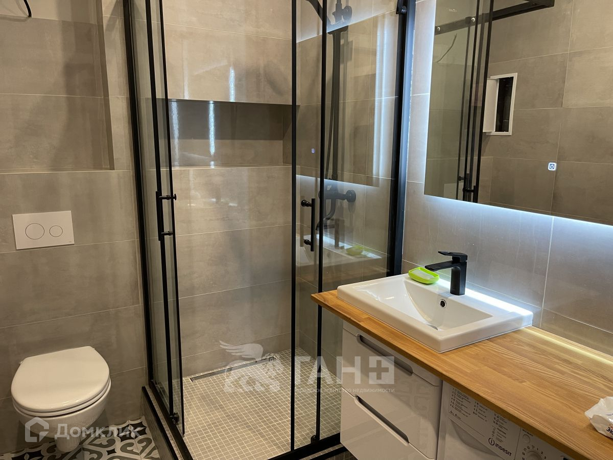 - В ванной установлена душевая кабина "Cezares" унитаз-инсталляция и зеркало со встроенной фоновой подсветкой.