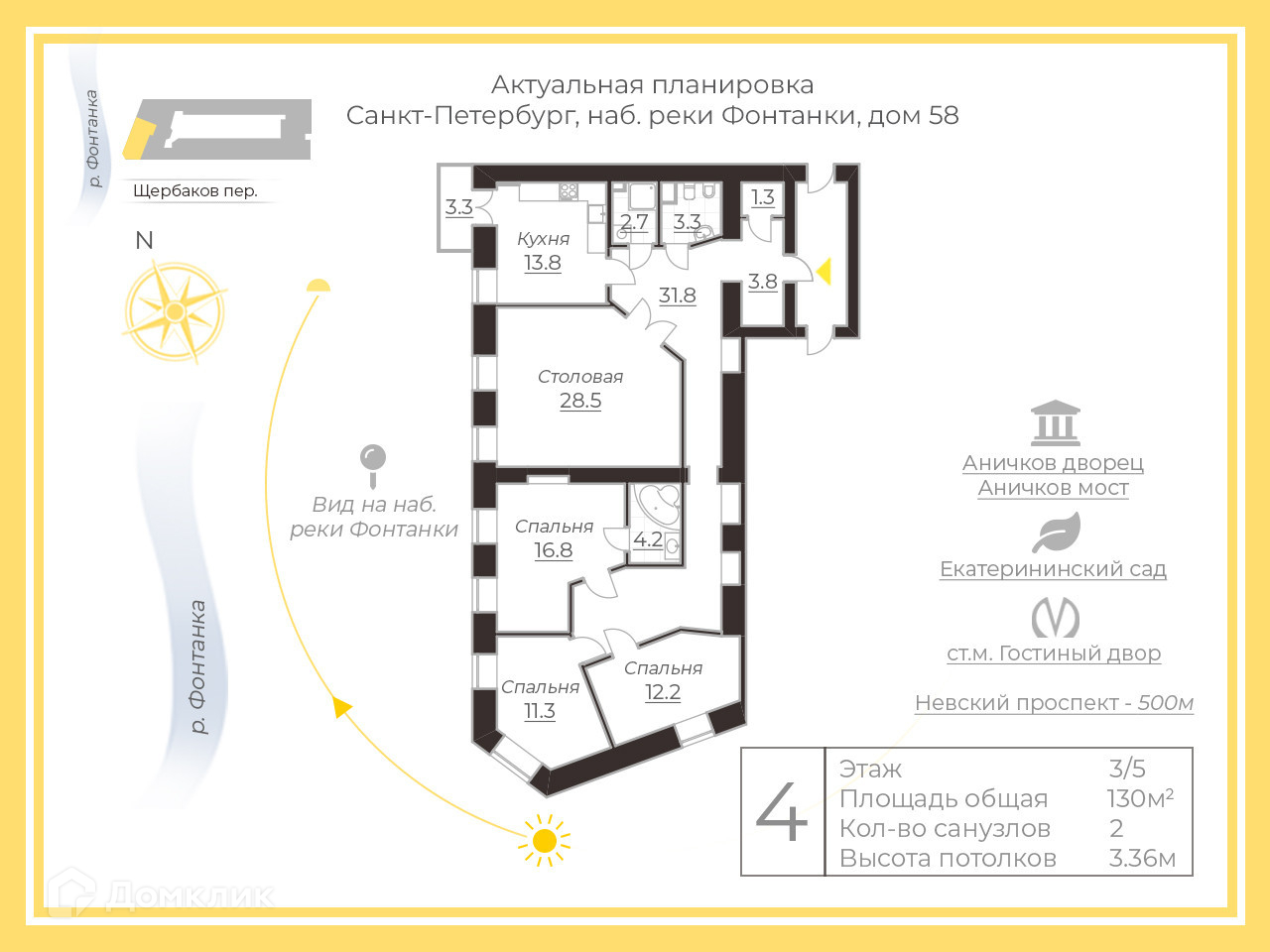 4-комнатная квартира, 130 м2, этаж 3 / 5, на продажу в Санкт-Петербурге, набережная реки Фонтанки, 58