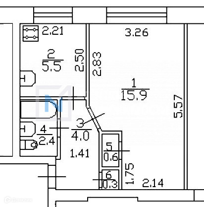 Общая площадь 29 кв.м, площадь комнаты 15.9 кв.м., площадь кухни 5.5 кв.м, коридор 4 кв.м, площадь санузла 2.4 кв.м, кладовки 0.6 и 0.3 кв.м.