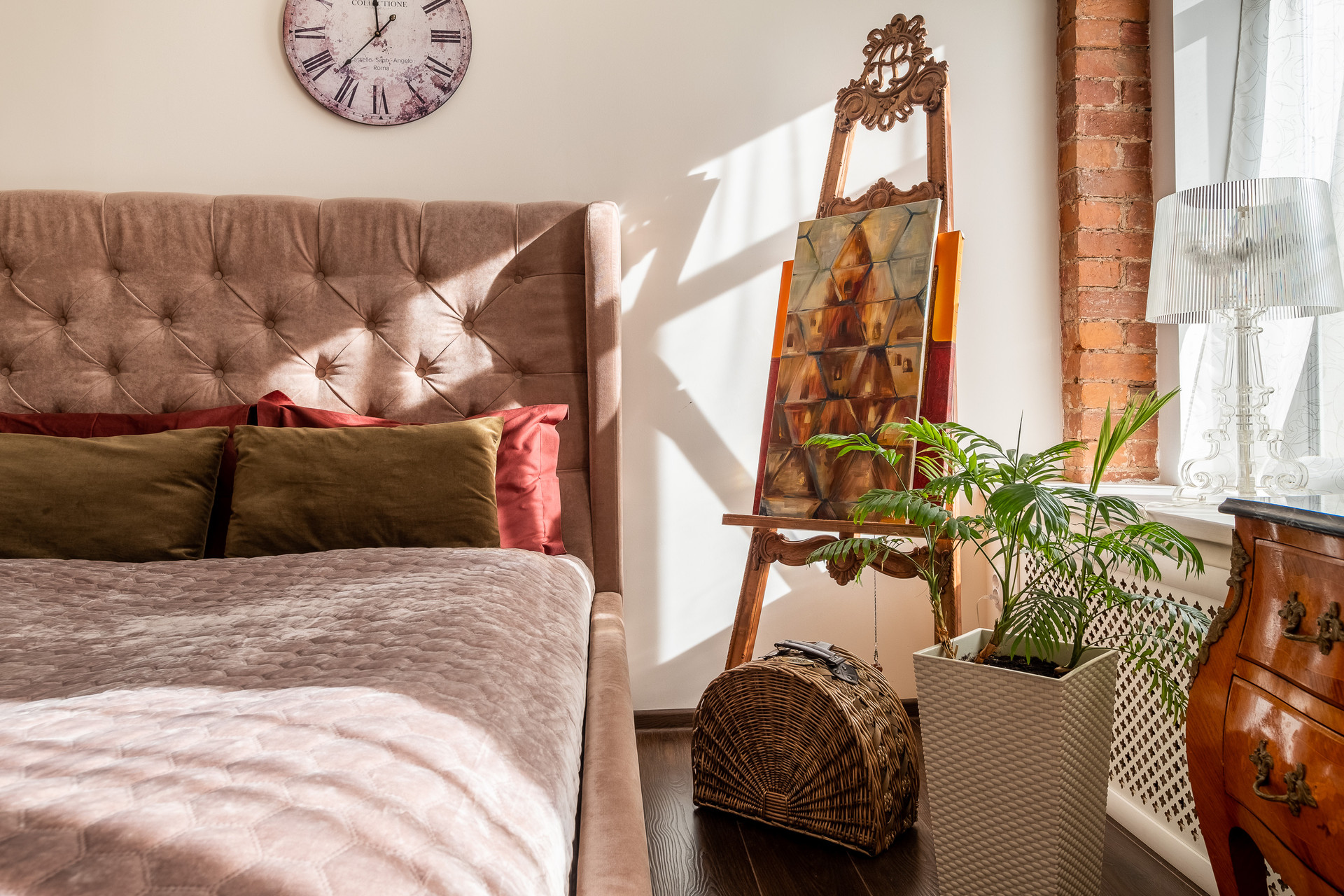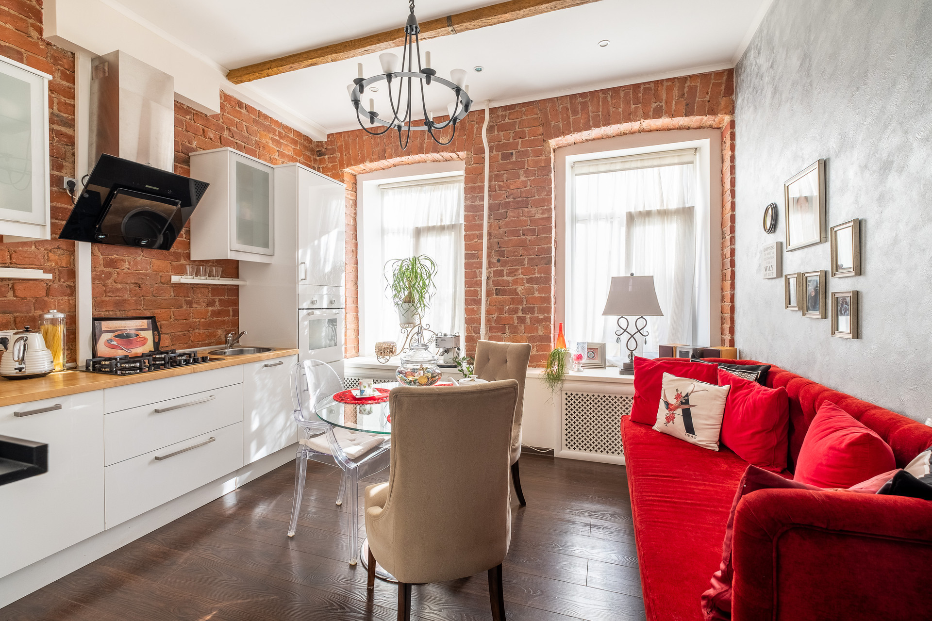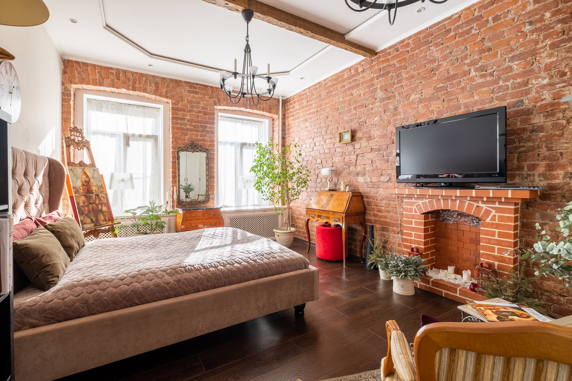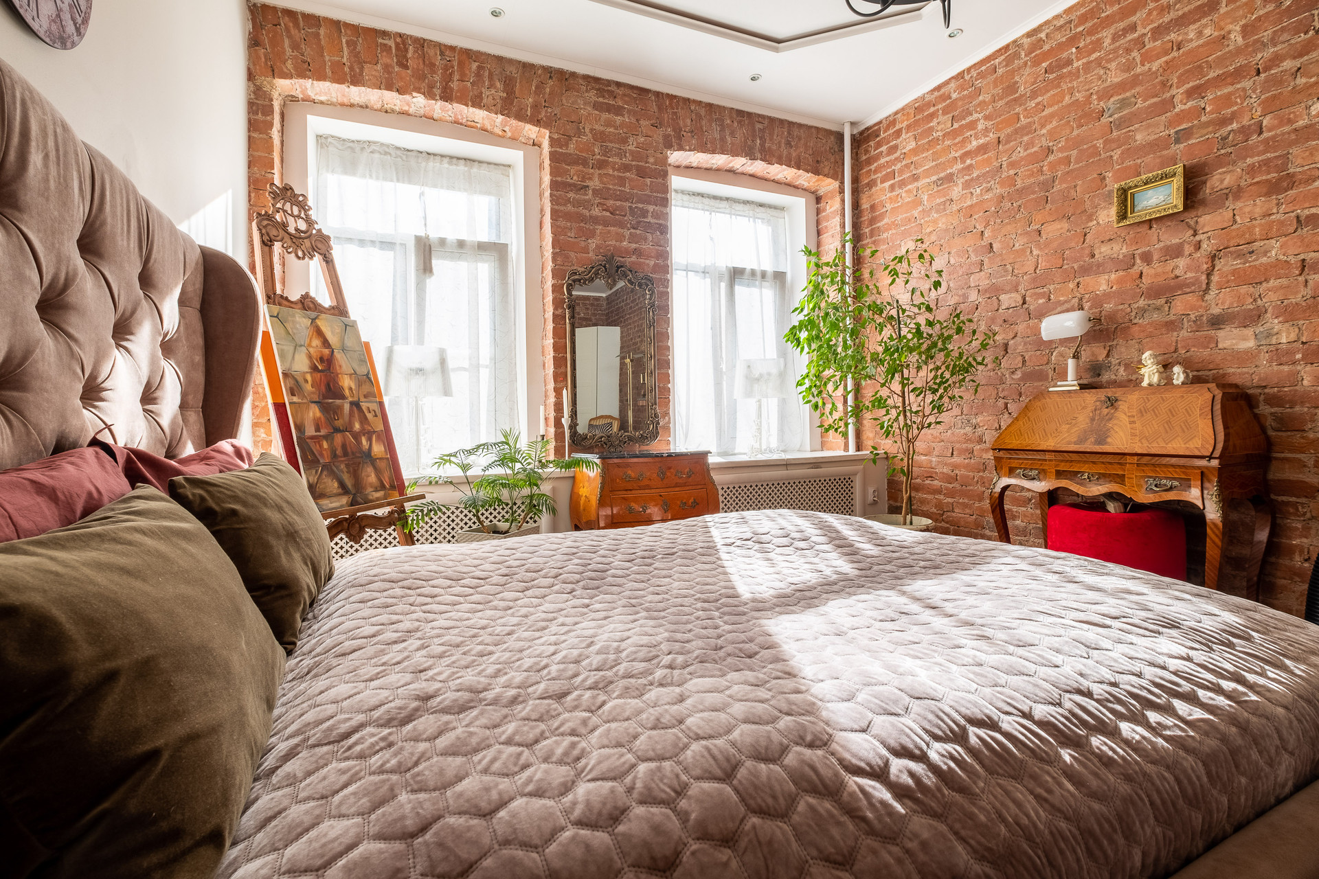 В квартире выполнен ремонт в стиле Гранж с использованием кирпичной кладки, деревянных балок и кованных элементов в декоре. Антикварная мебель и текстиль из бархата создают в квартире выразительность и оригинальность.  Продается со встроенной мебелью и техникой.