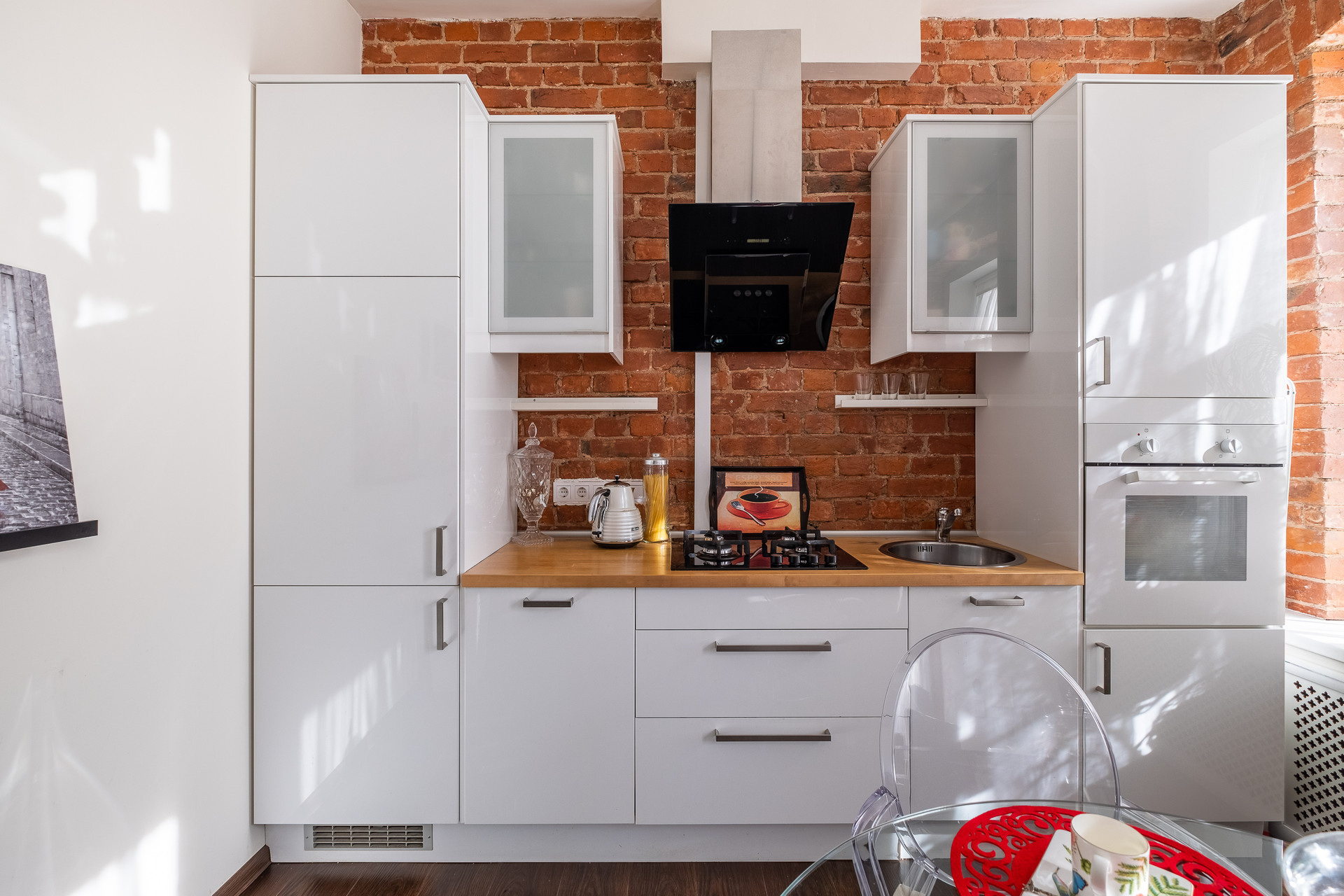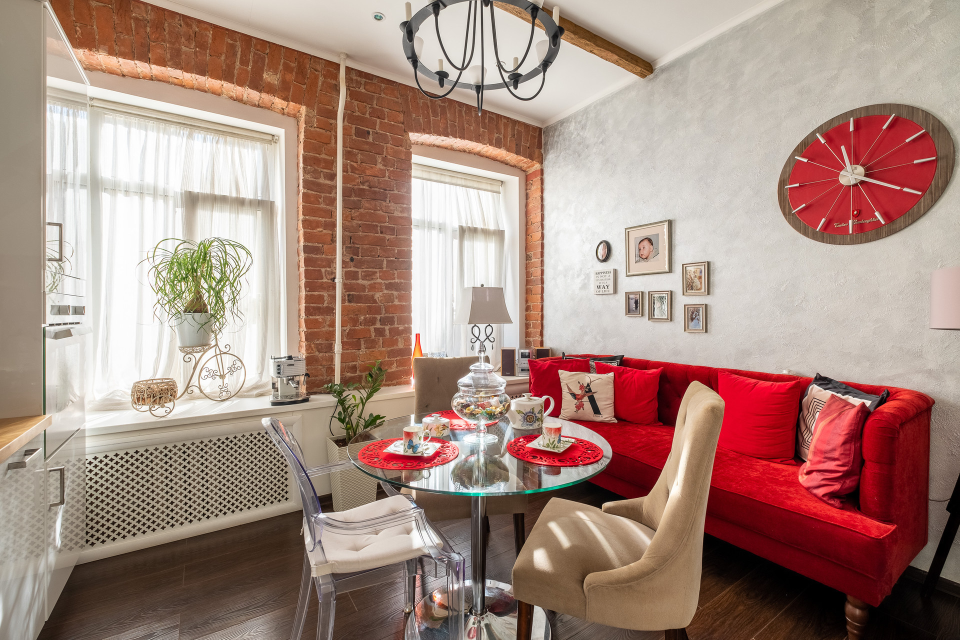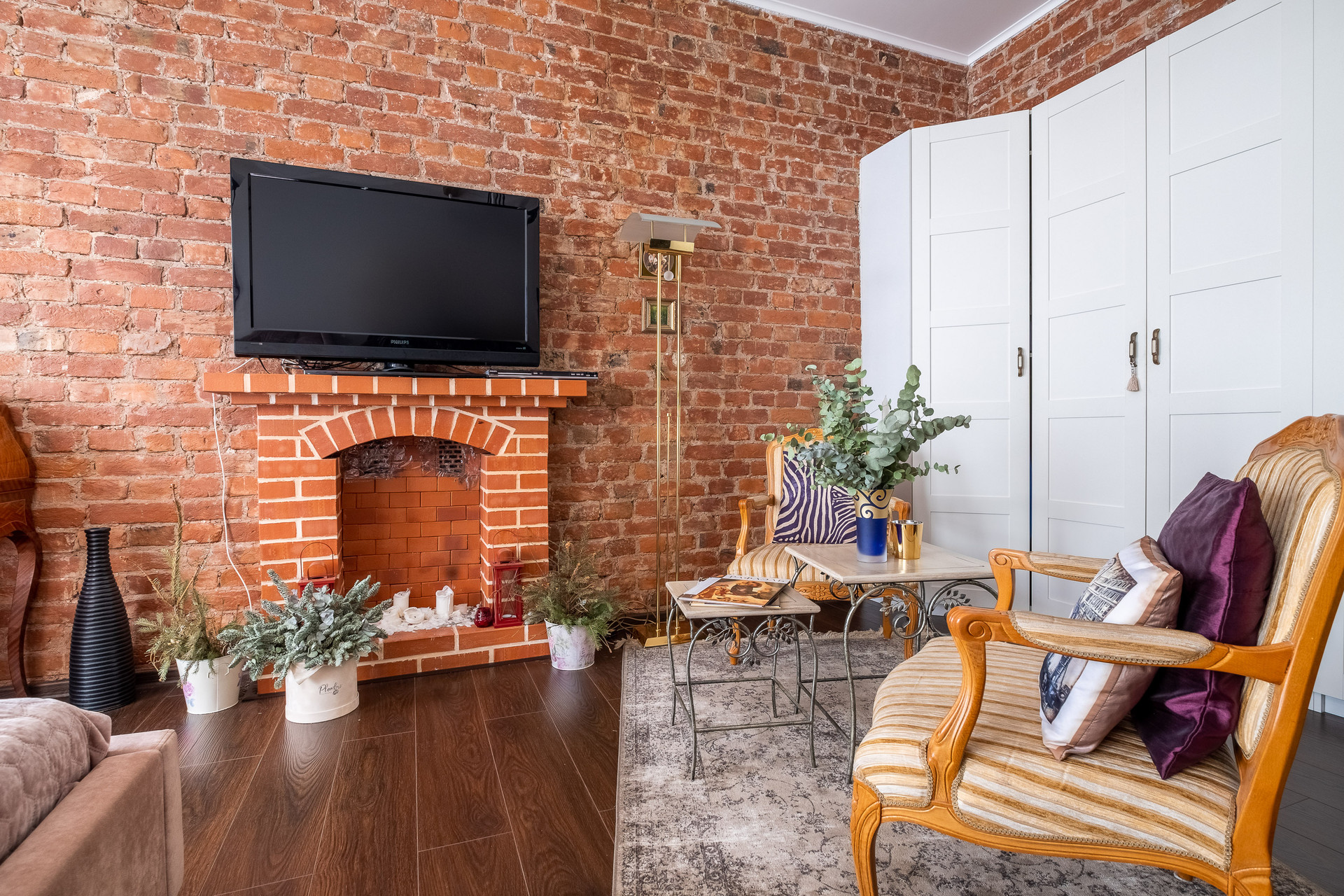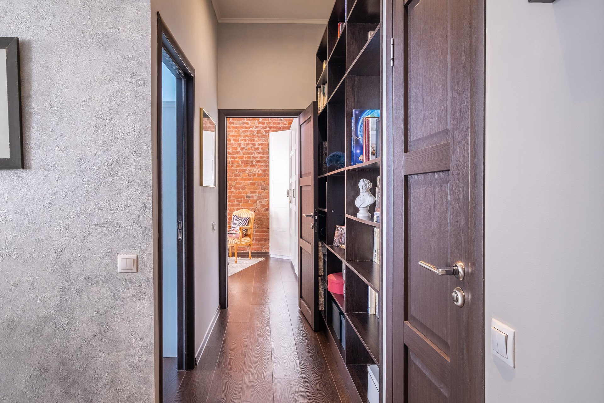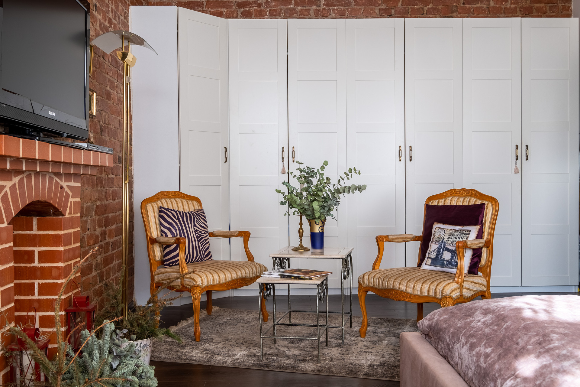 В квартире выполнен ремонт в стиле Гранж с использованием кирпичной кладки, деревянных балок и кованных элементов в декоре. Антикварная мебель и текстиль из бархата создают в квартире выразительность и оригинальность.  Продается со встроенной мебелью и техникой.