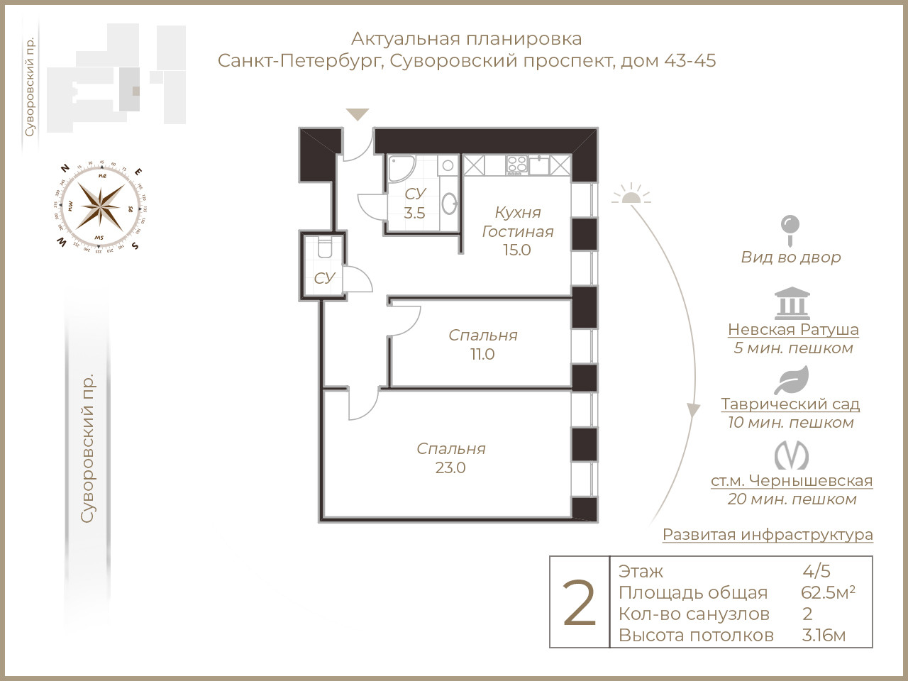 Квартира общей площадью 62,5 кв.м. имеет функциональную планировку. Кухня-гостиная 15кв.м и две изолированные спальни 11кв.м и 23кв.м выходят в тихий двор вдали от шумного Суворовского проспекта. В квартире два с/у и достаточное количество мест для хранения. Юго-восточное расположение квартиры и 4этаж делают квартиру необычайно светлой и уютной.