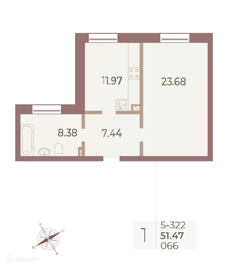 Общая площадь 51.4 м2
