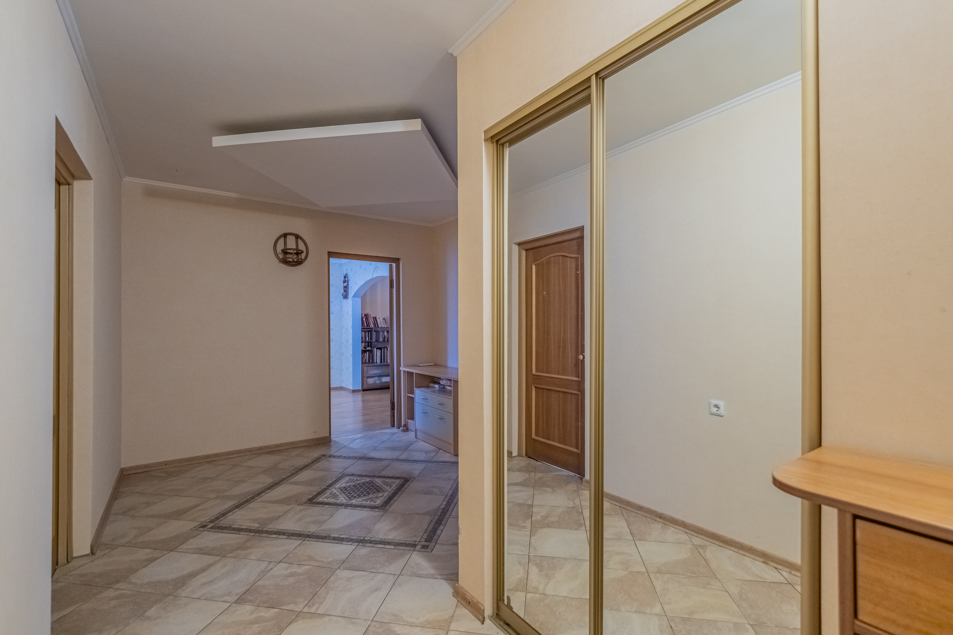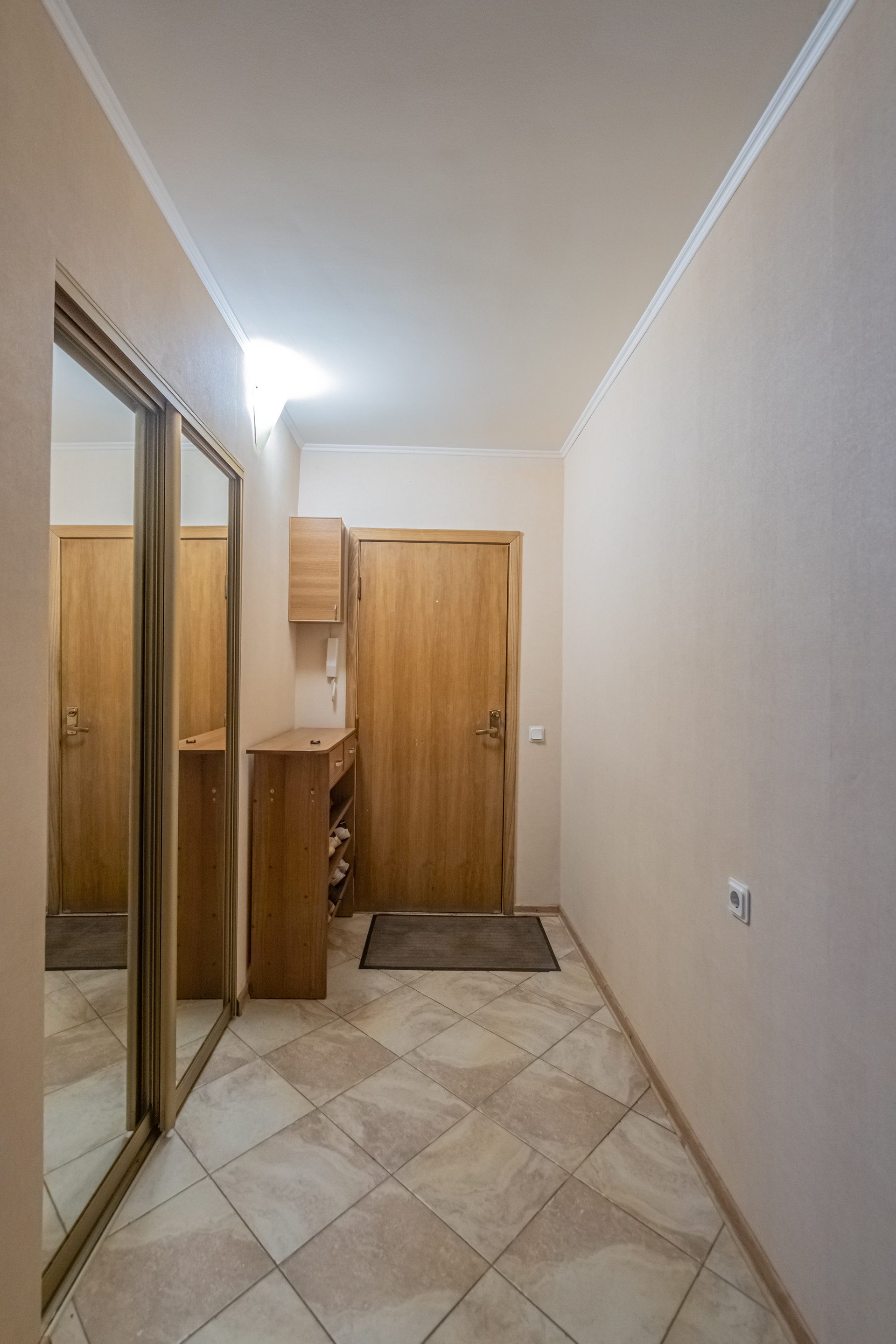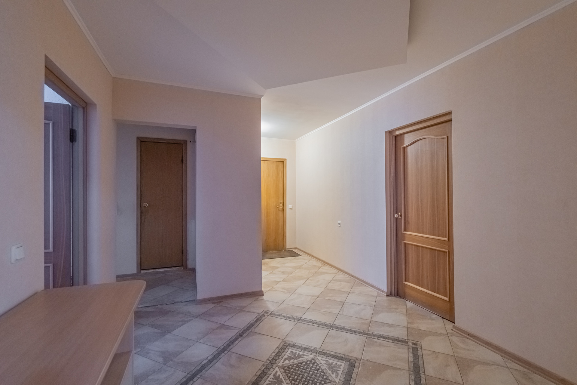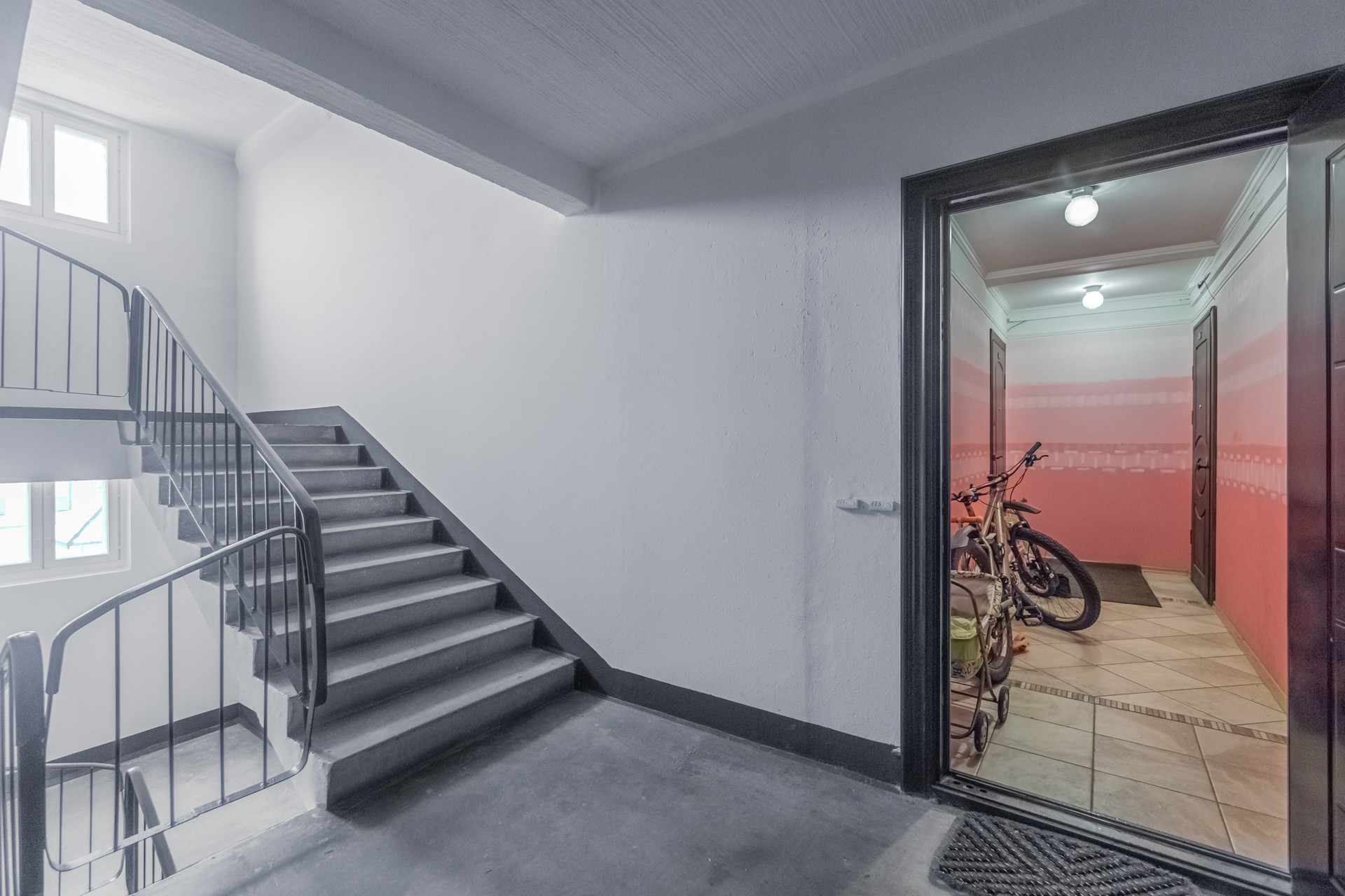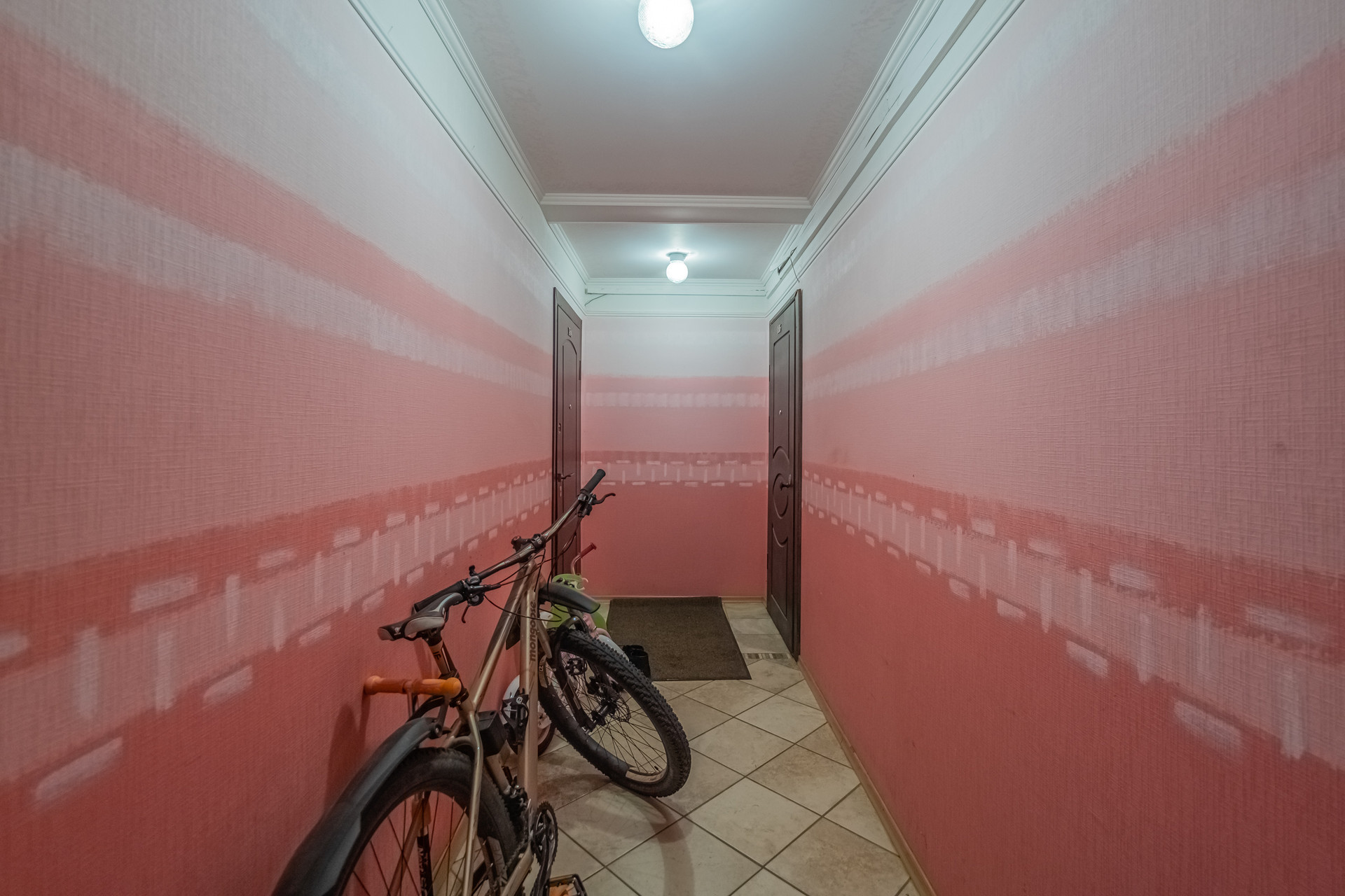 Между лестничной площадкой и входом в квартиру предусмотрен коридор с приватным доступом. Места там достаточно много, вы сможете спокойно оставить велосипед, коляску и т.п., и быть уверенными в их сохранности.