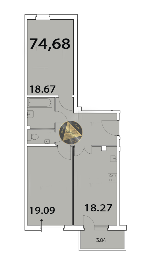 Квартира находится на 2 этаже. Общая площадь квартиры 74,68 м2. Уютная спальня 18.67 м2. Светлая гостиная 19.09 м2. Общая жилая 37.76 м2.  Многофункциональный коридор 10.7 м2. Просторная кухня  18.27 м2. Лоджия 3.84 м2. Санузел 4.14 + 1.87 м2.