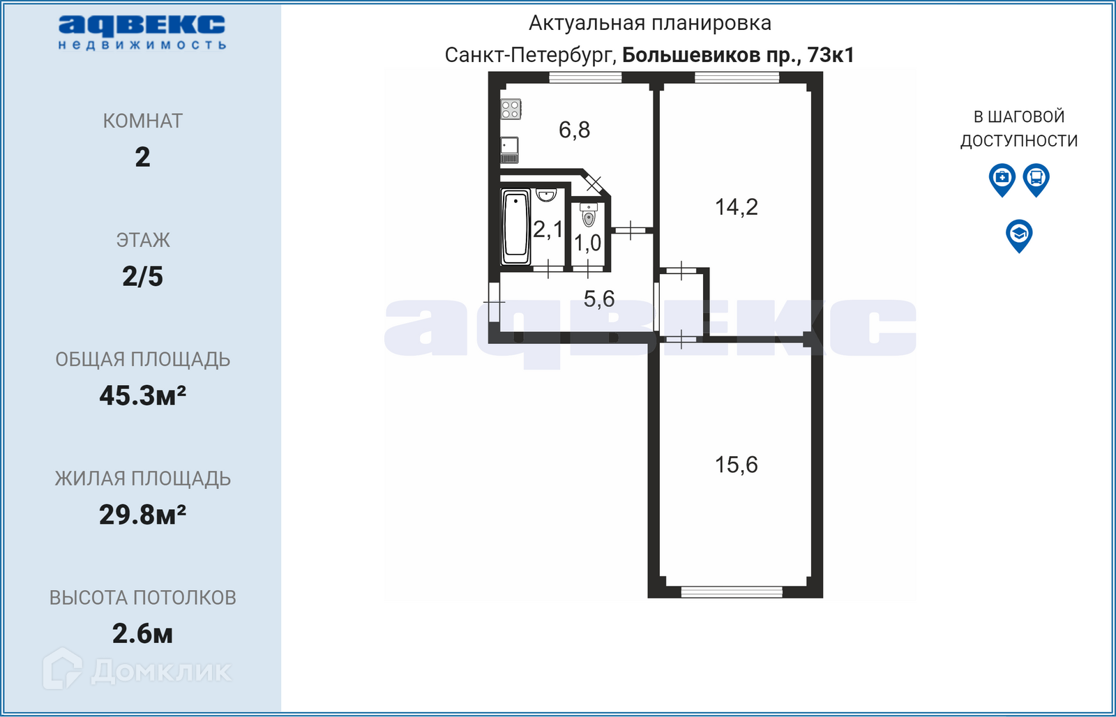 2-комнатная квартира, 45.3 м2, этаж 2 / 5, на продажу в Санкт-Петербурге, проспект Большевиков, 73к1