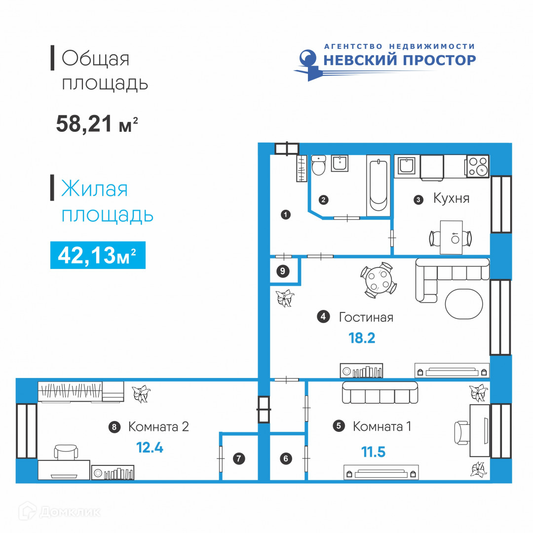 Общая площадь 58.2 м2